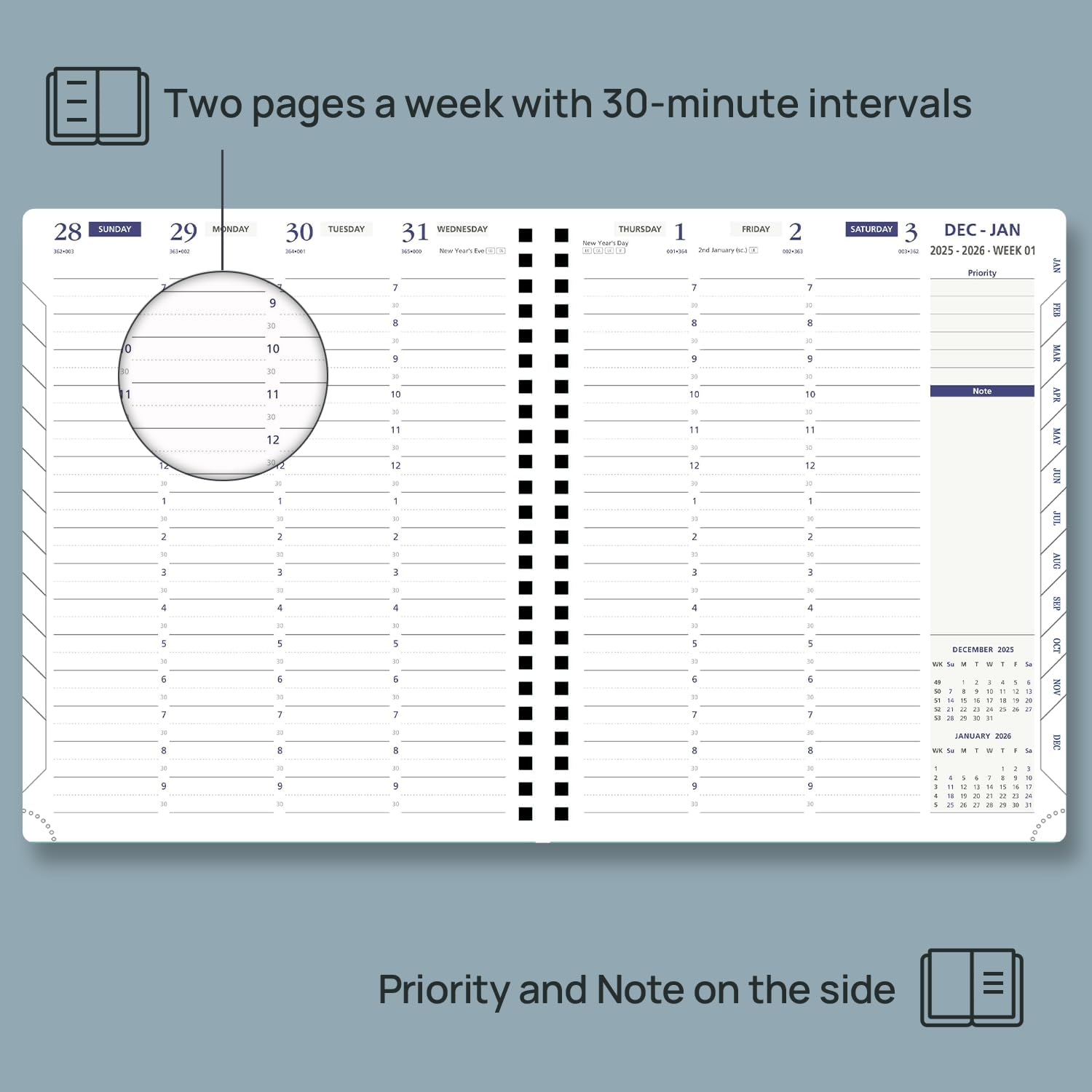 - 2 PAGES PER WEEK WITH TIME SLOTS - The vertical layout offers 2 pages per week to manage your time in 30-minute intervals from 7.am to 9.30 pm each day, ensuring enough room to write a to-do list. Additionally, each monthly layout includes an overview of the month and a priority area on the right side.