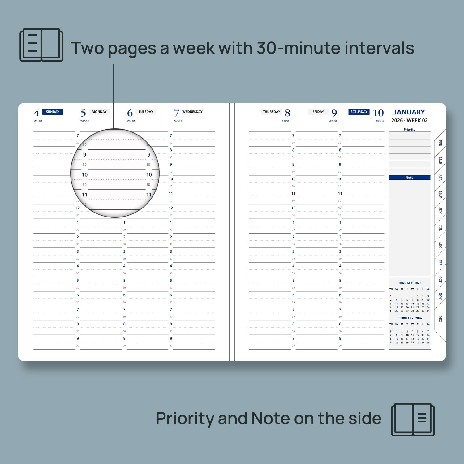- 2 PAGES PER WEEK WITH TIME SLOTS - The vertical layout offers 2 pages per week to manage your time in 30-minute intervals from 7.am to 9.30 pm each day, ensuring enough room to write a to-do list. Additionally, each monthly layout includes an overview of the month and a priority area on the right side.