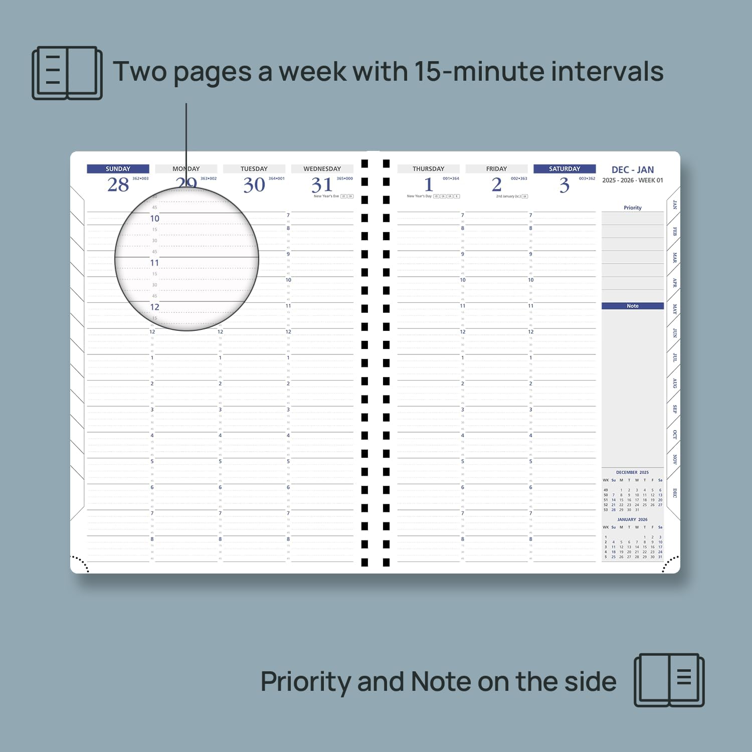 - 2 PAGES PER WEEK WITH TIME SLOTS - The vertical layout offers 2 pages per week to manage your time in 15-minute intervals from 7:00 am to 9:00 pm each day, ensuring large room to write a to-do list. Additionally, each monthly layout includes an overview of the month and a priority area on the right side.