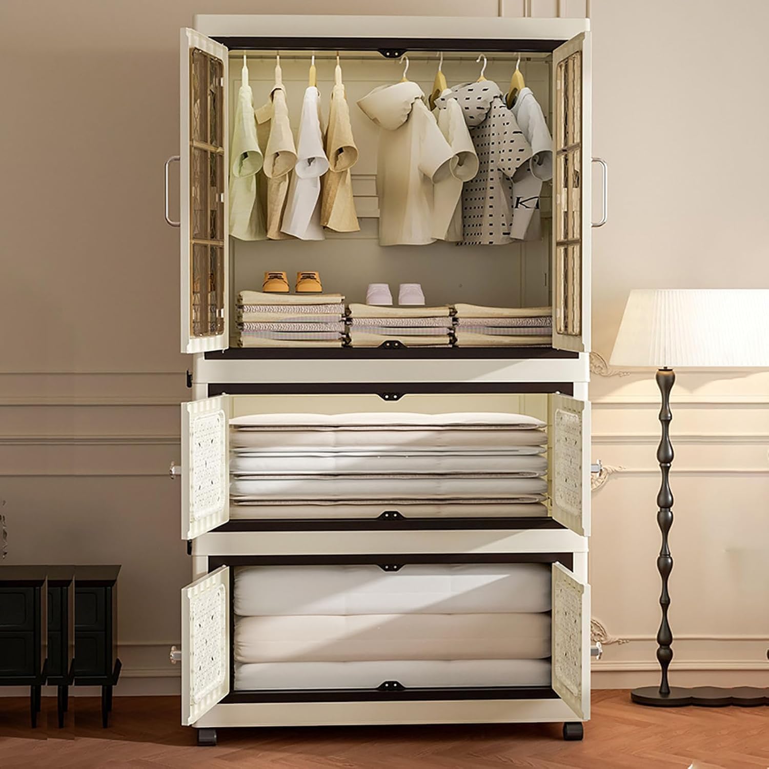 - Foldable, Stackable, and Movable: Our SunSettler stackable storage cabinets fold easily in four steps, ensuring compact storage in any space. They have grooves for secure stacking and hidden wheels for effortless mobility