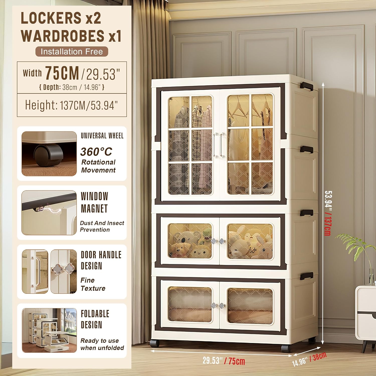 4 Tier Stackable Storage Bins with Lid, Plastic Collapsible Cabinet with Wheels, Large Closet Organizer, Foldable Storage Cabinets for Home and Office (2+1 Transparent Plus)