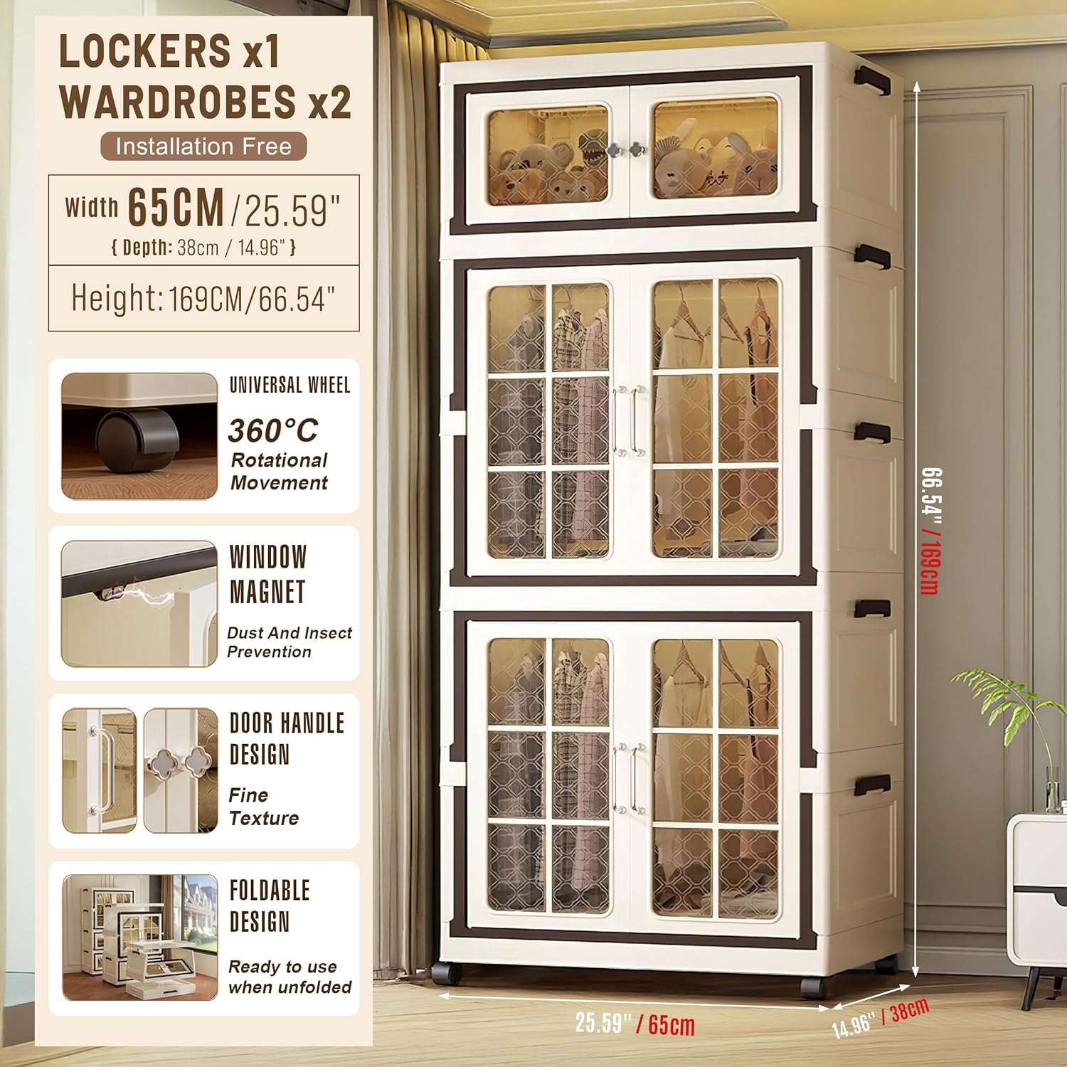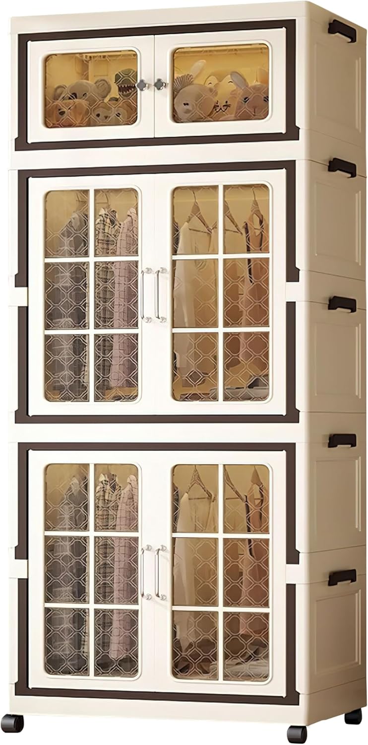 - Large Capacity, Versatile, and Practical: foldable storage cabinets equipped with doors and wheels, expands to generous dimensions of 14.96"D x 25.59"W x 66.54"H and can support a maximum weight of up to 110lb. The large storage box has 4pcs 360° rotating wheels, allowing easy movement—an essential large storage bin for homes and dorms
