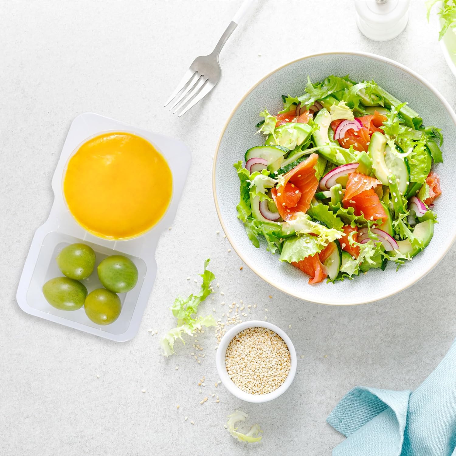 - The Right Size: The portion control containers hold a perfect portion for little mouths/fingers and for lunchboxes (not too high). Lid divides 2 compartments so the 2 foods do not mix! No one wants a salsa in veggie dip. Ideal for babies just starting solid or snack containers for on the go. Very convenient for baby daycare or general meal prep. If you are on a diet, this would be the perfect portion too