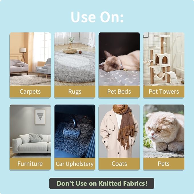 - Widely Use:3 Types Reusable Pet Hair Remover for Different Materials --- Copper pet hair remover be used for heavy duty and thick piled items, such as carpet, rug, couch, furniture, blanket, cat tree, car interiors, winter coats and etc. Plastic fabric shaver can be used for soft and thin fabrics, like upholstery, ottoman, velvet, bed sheet, sweatshirt and etc. Soft Rubber Brush:Crafted from premium TPR, This product embodies safety, reliability, and meticulous craftsmanship,its high-quality build provides peace of mind during grooming.Easily remove pet hair from curved surfaces and corners