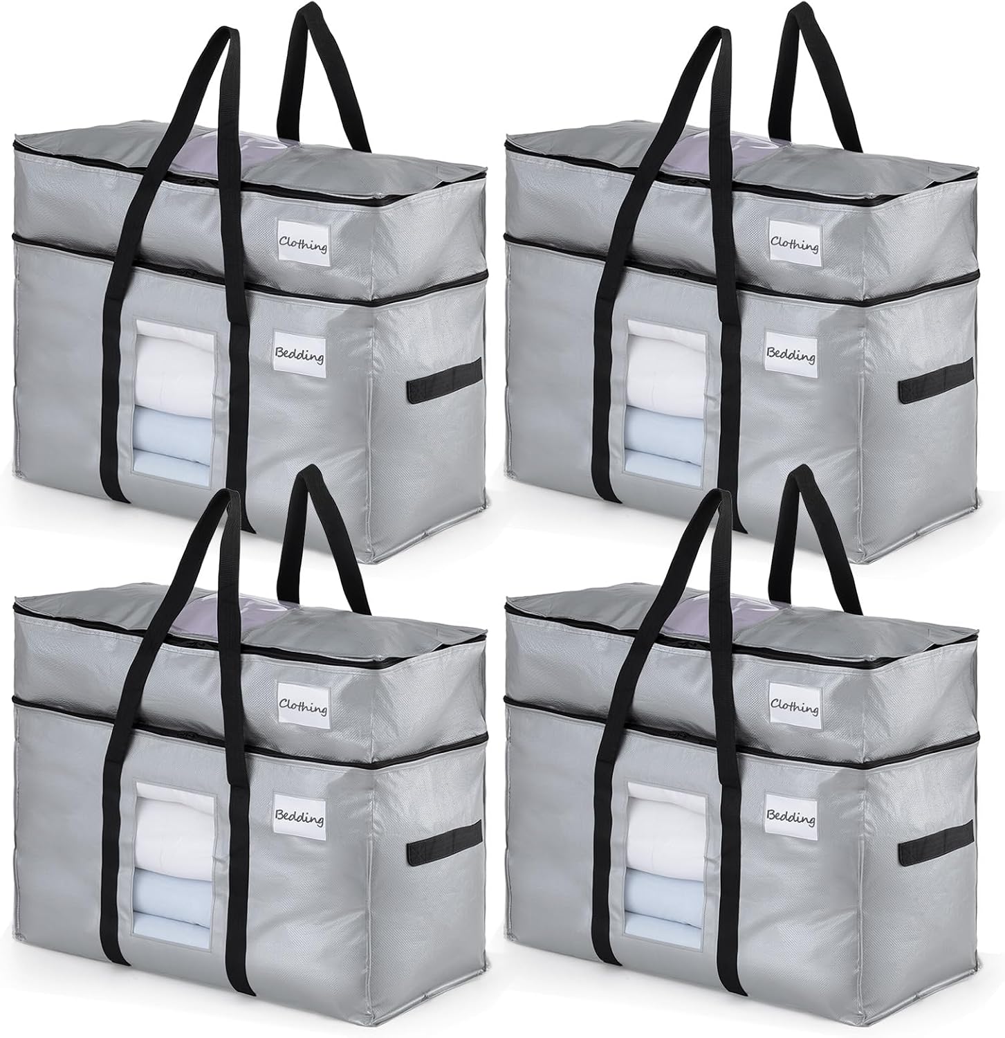 TAILI 2 Tier Extra Large Moving Bags, 4 Pack Silver Heavy Duty Totes For Storage with Visible Window, Wrap Around Handles, Storage Bags for Space Saving, Alternative to Moving Boxes