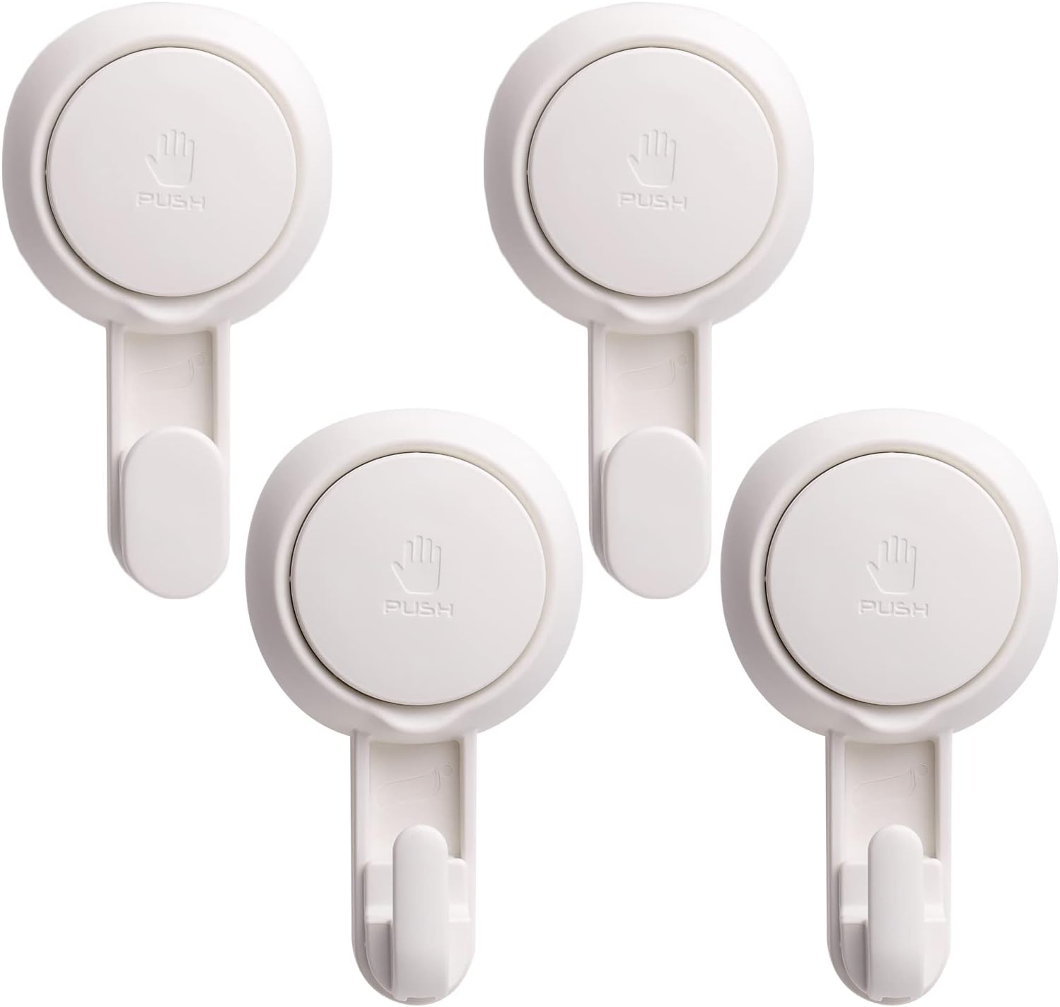 LEVERLOC Heavy Duty Suction Cup Shower Hooks 4 Pack, Damage-Free Shower Hangers for Inside Bathroom Wall, Powerful Vacuum Suction Towel Hooks, Loofah Holders, Easy to Install and Remove, White