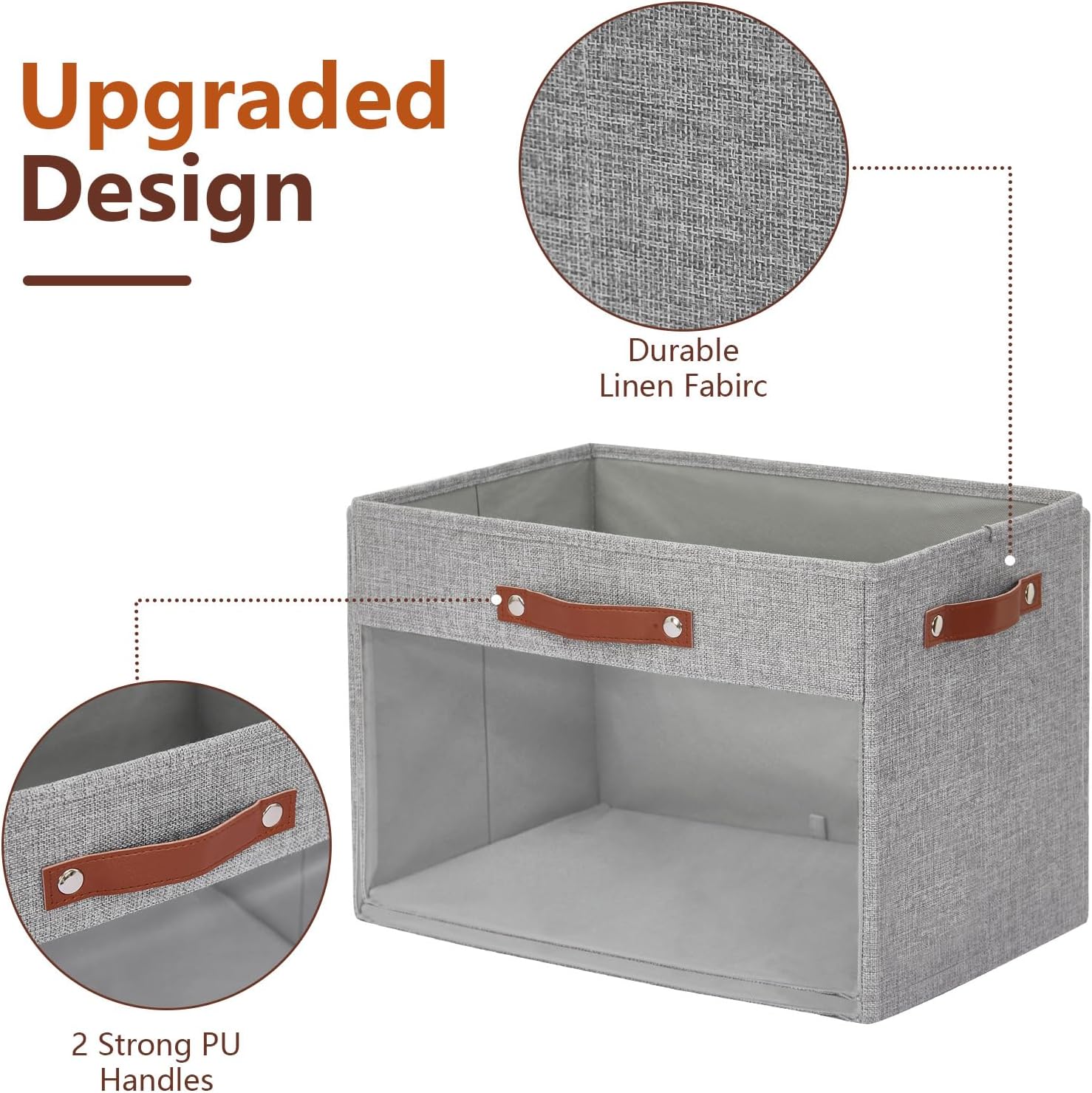 Extra Large Storage Baskets with Clear Window, See Through Closet Organizer with PU Handles, Linen Foldable Storage Bins for Organizing Clothes, Toys, Books (Gray)