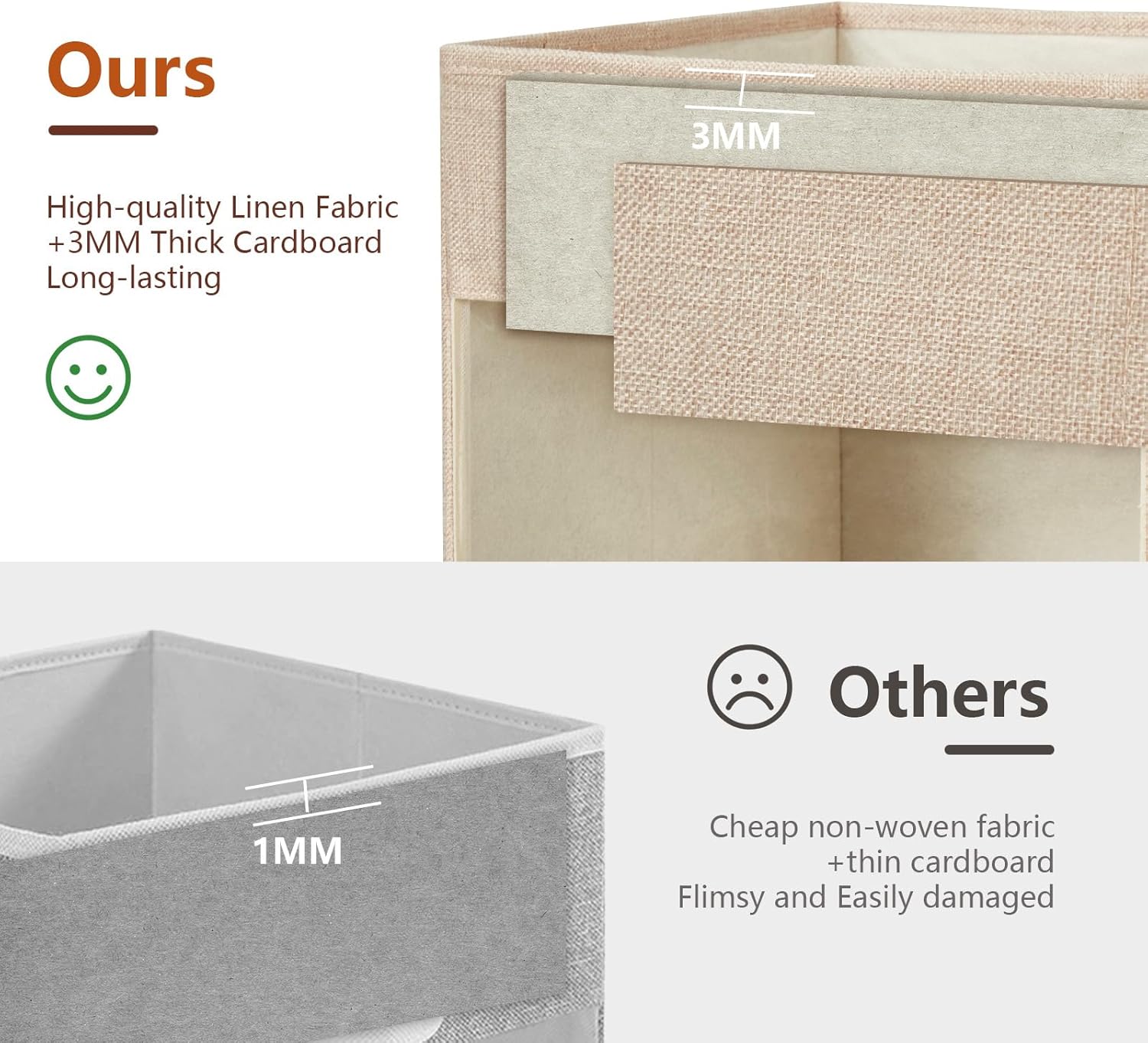 - Premium Linen & Sturdy Cardboard Construction: The storage bins are built to last with a durable blend of high-quality linen fabric and thick, reinforced cardboard. The precision-cut design ensures a polished look, while the robust materials resist sagging, tearing, or warping—ideal for storing heavy items. These closet organizers elevate any space while standing up to daily use.