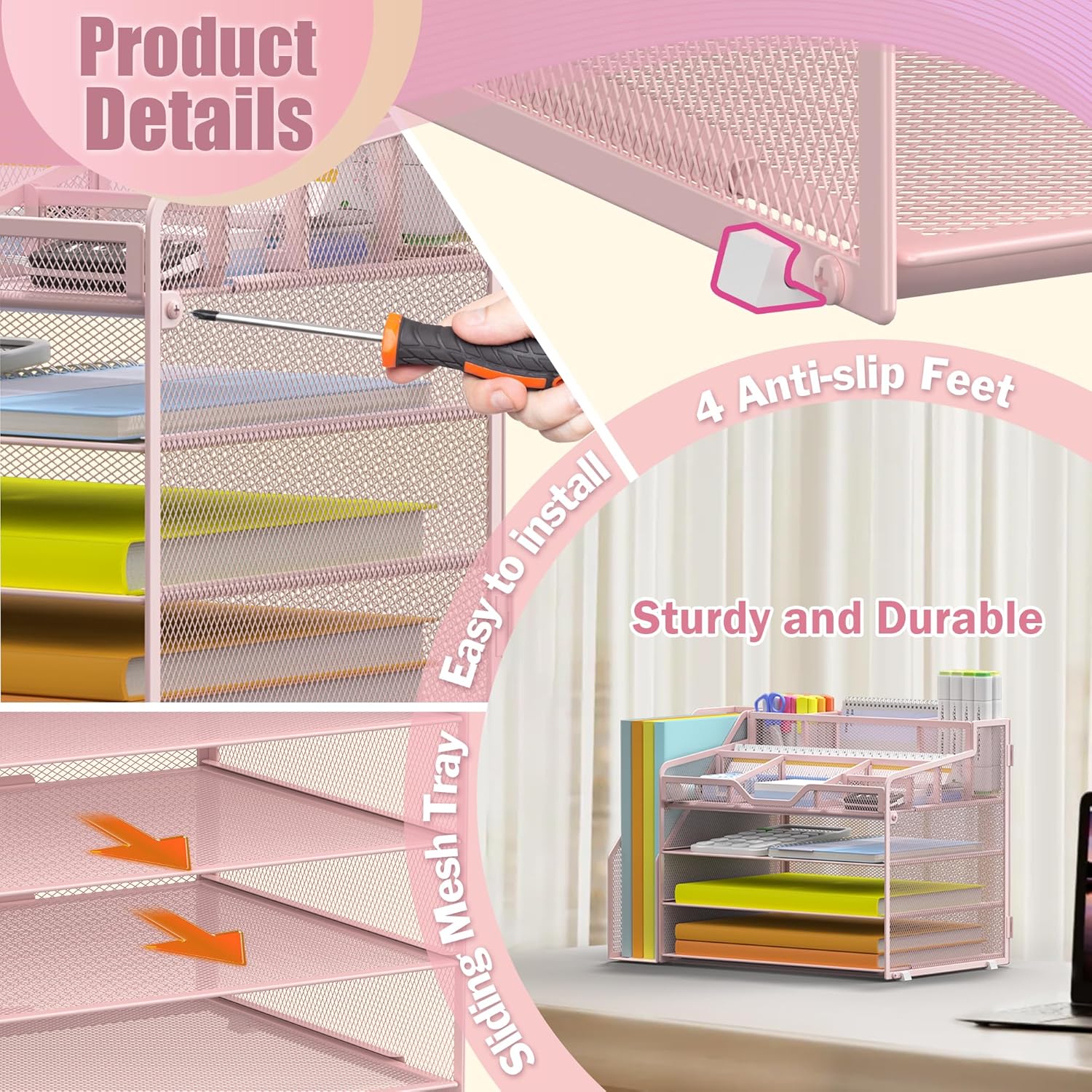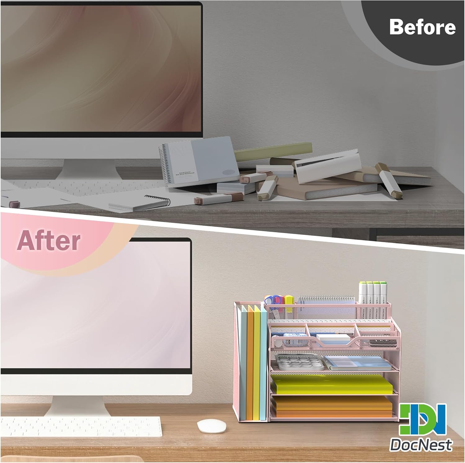 Docnest 4 Tier Mesh Desk Organizer with File Holder – Multi-Functional Paper Letter Tray with 5 Adjustable Compartments, 3 Pen Holders, Desktop Storage for Files, Mail, Stationery – Pink