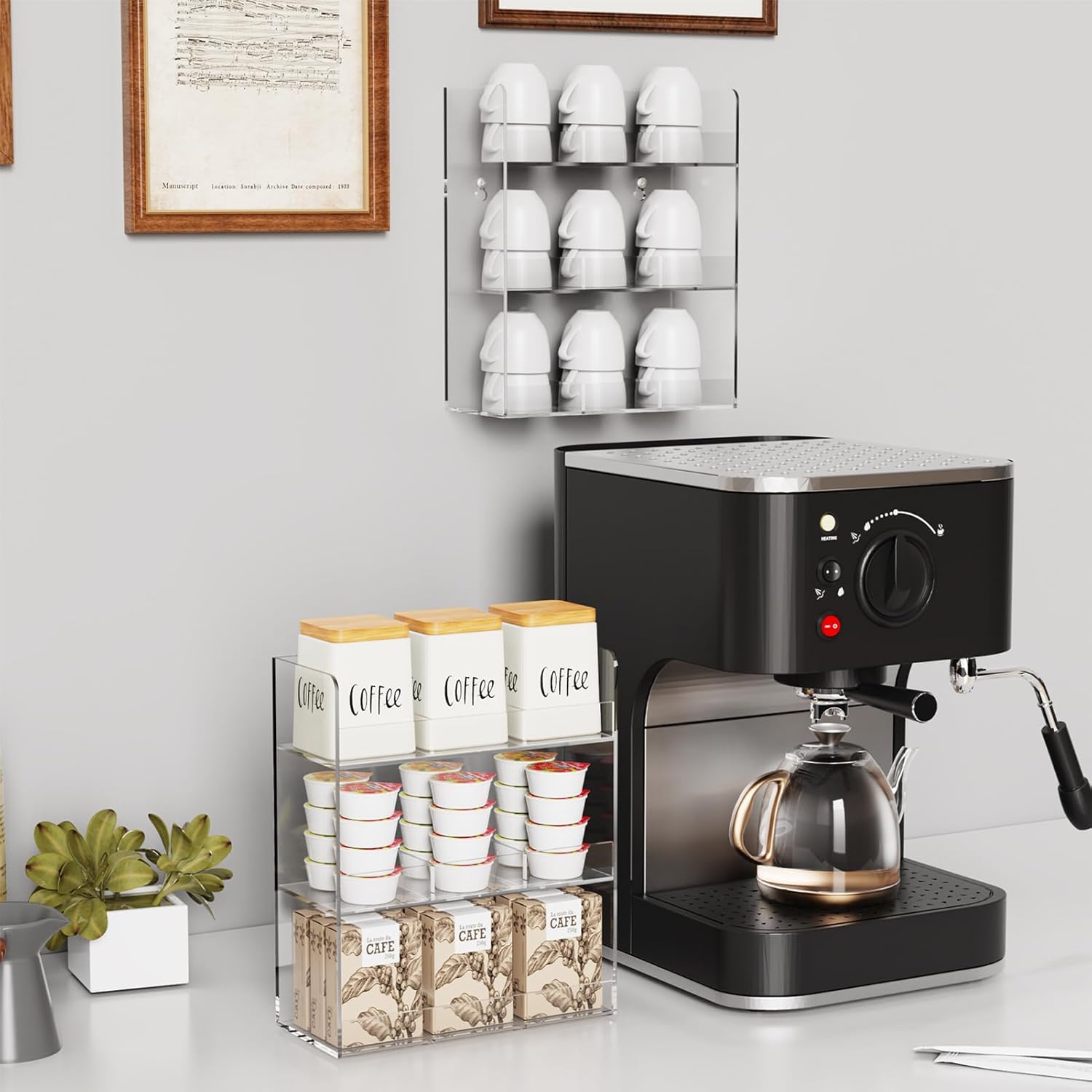 Acrylic Tea Bag Organizer, 3 Layers Tea Bag Holder for Tea Packets, No Assembly Required, Wall Mount Display Tea Caddy for Countertop or Cabinet, 9 Slots