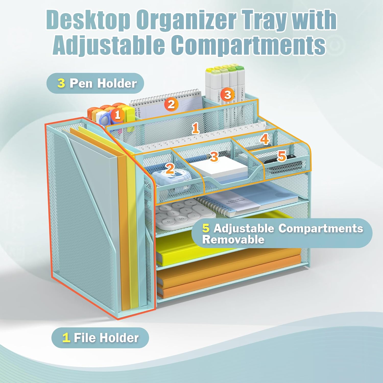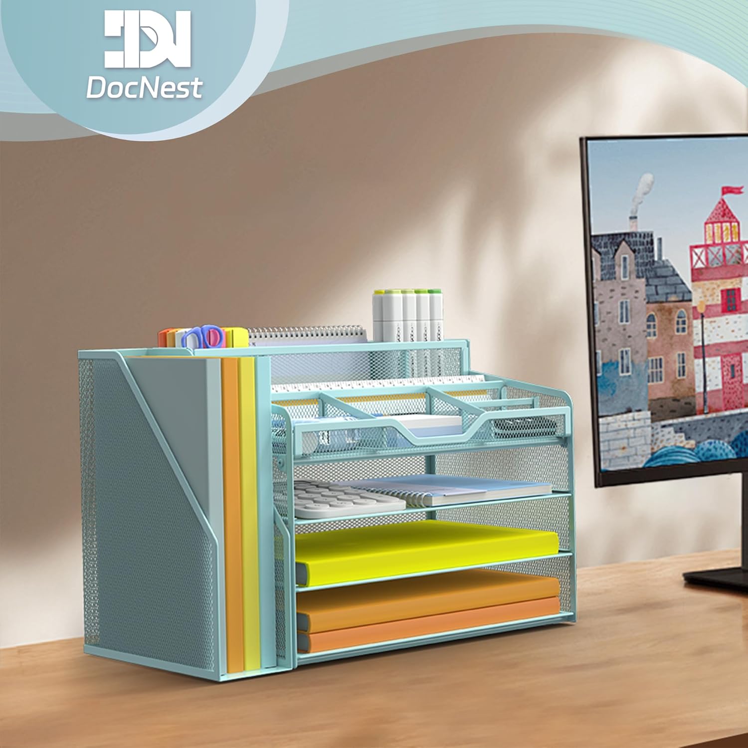 Docnest 4 Tier Mesh Desk Organizer with File Holder – Multi-Functional Paper Letter Tray with 5 Adjustable Compartments, 3 Pen Holders, Desktop Storage for Files, Mail, Stationery – Blue