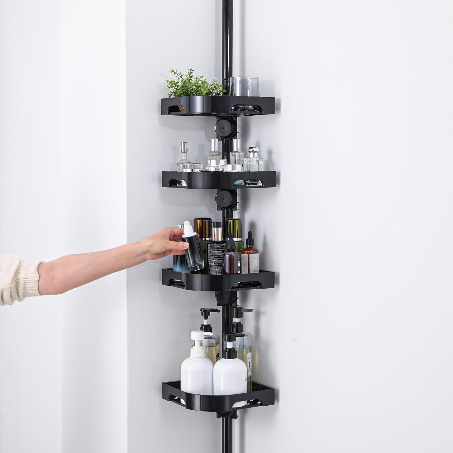 Tension Pole Shower Caddy Organizer with4 Tier L-Shaped Rust Resistant Bathroom Corner Shelves with 34-124 Inch Adjustable No Drilling Quick Install Shower Rack for Bath Essentials (Black)