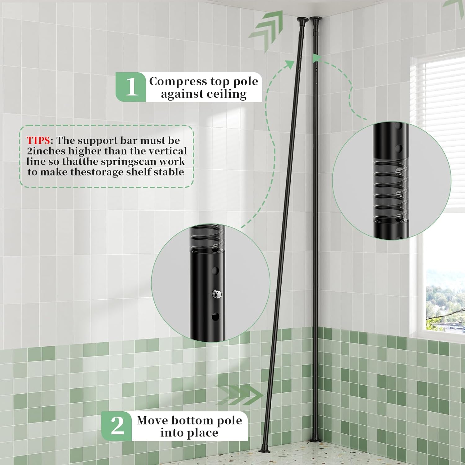 - 【Fits All Shower Heights】The adjustable shower shelves fits any space from 34 to 124 inches. Whether it is a high-rise apartment or a low-rise residence, you can adjust it according to the actual height of the bathroom; at the same time, the freestanding shower organizer can be placed not only in the bathroom, but also in the kitchen, RV, laundry room, etc., to making your bathroom or shower looks nice and organized. (Note: This shower caddy set is not designed for sloped ceilings)