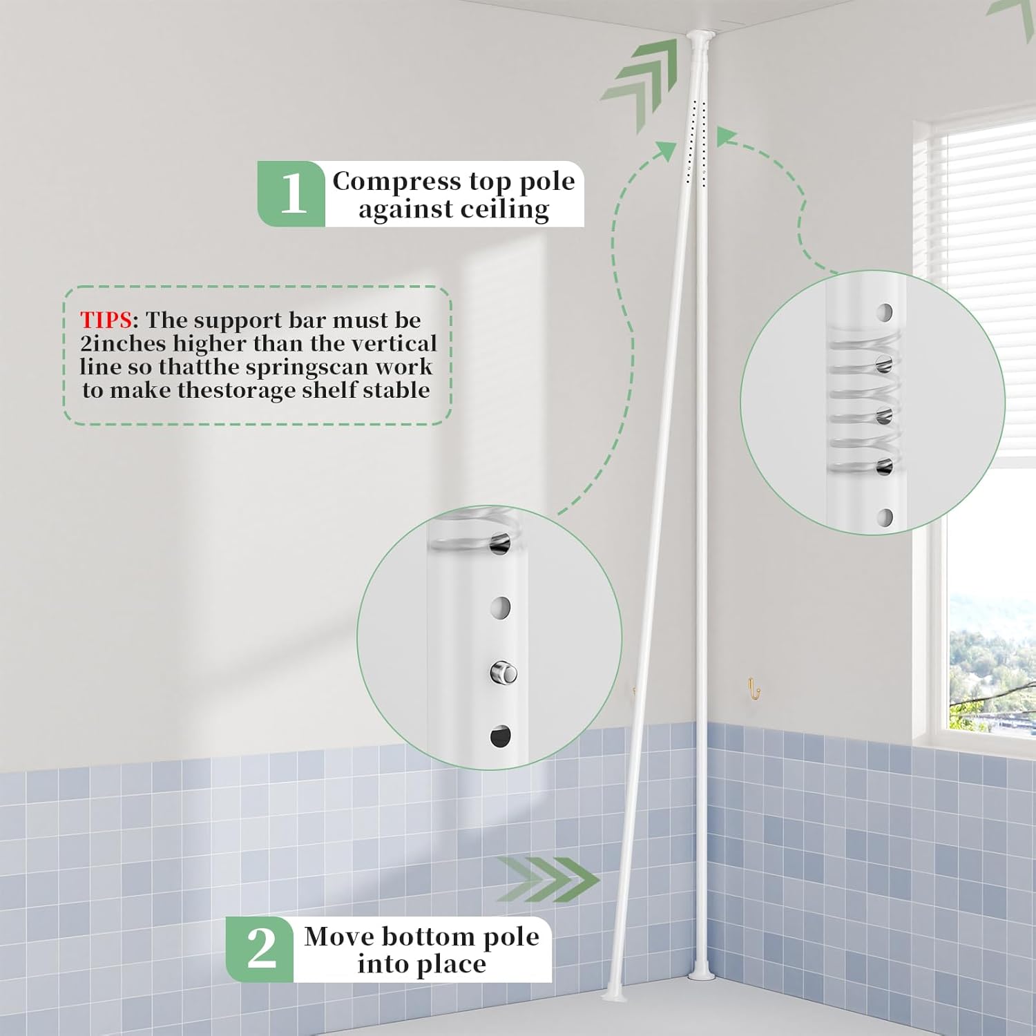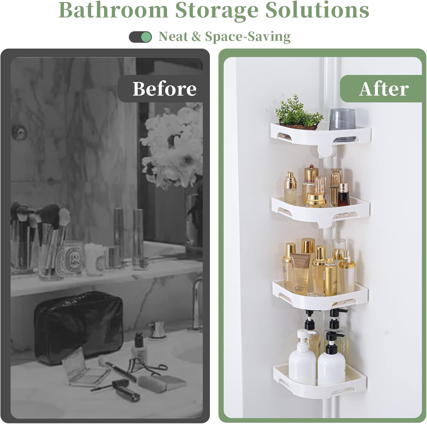 - 【Fits All Shower Heights】The adjustable shower shelves fits any space from 34 to 124 inches. Whether it is a high-rise apartment or a low-rise residence, you can adjust it according to the actual height of the bathroom; at the same time, the freestanding shower organizer can be placed not only in the bathroom, but also in the kitchen, RV, laundry room, etc., to making your bathroom or shower looks nice and organized. (Note: This shower caddy set is not designed for sloped ceilings)
