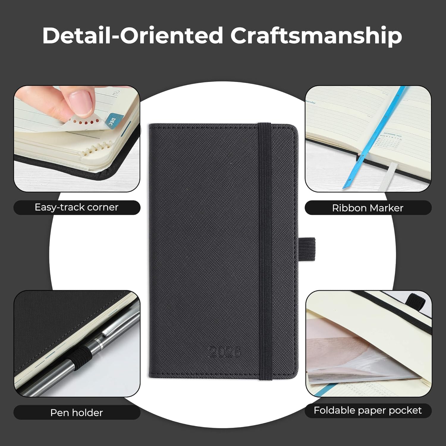 Weekly Monthly 2026 Planner (Jan.26-Dec.26),6.5"x3.75",12 Months Agenda Plan with Month Tabs & Pocket,Expenses/Note Pages, Appointment Book Calendar with Hardcover Vegan Leather Cover,Black