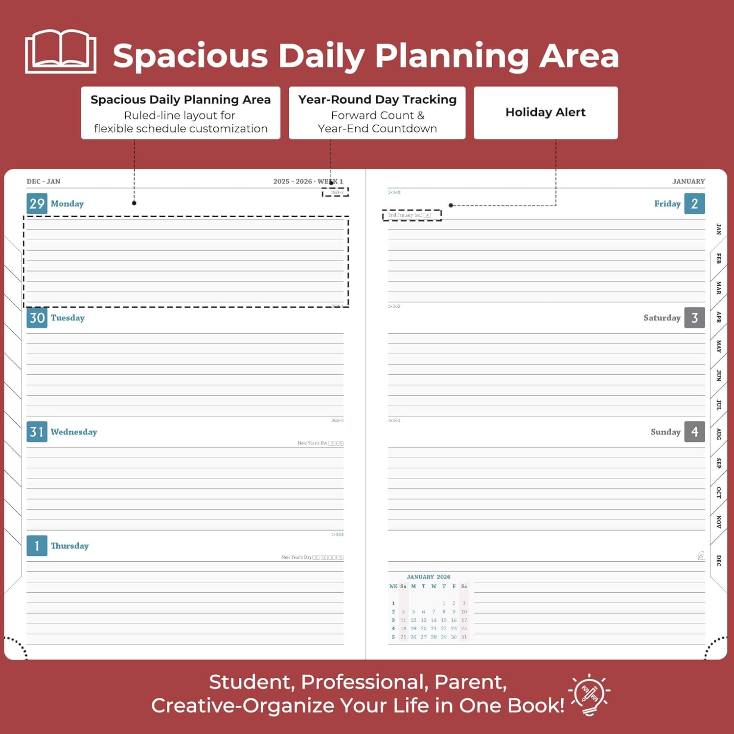 - Professional Grade Material for Your Daily Planner: Crafted with FSC 100GSM thick paper, this 2026 planner ensures good writing with markers while gentle on your eyes through its ivory white pages. The leather soft cover and lay flat binding make it a calendar planner companion for busy professionals, students, and families