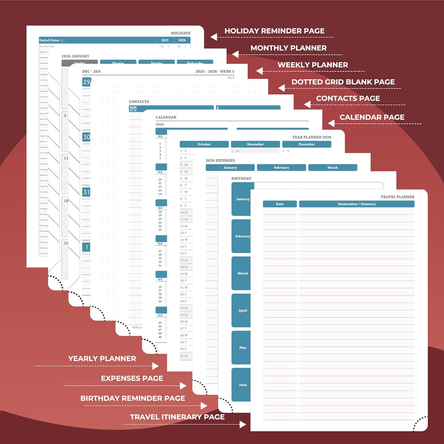 - Universal Design Planner: Suitable for a variety of people and scenarios. Professionals manage project progress, meeting arrangements and goals; student planner 2026 courses, exams and extracurricular activities; home users arrange travel, activitie