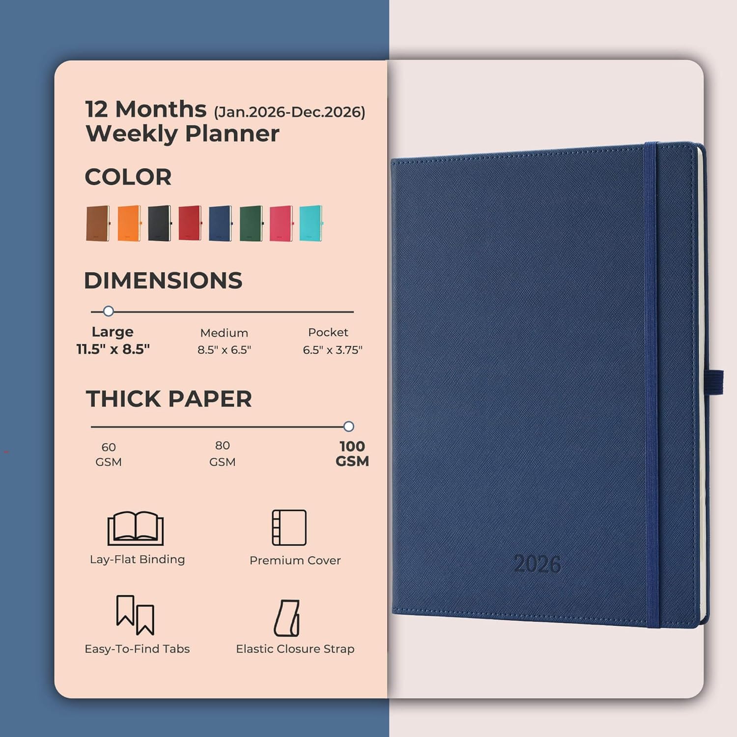 - Professional Grade Material for Your Daily Planner: Crafted with FSC 100GSM thick paper, this 2026 planner ensures good writing with markers while gentle on your eyes through its ivory white pages. The leather soft cover and lay flat binding make it a calendar planner companion for busy professionals, students, and families