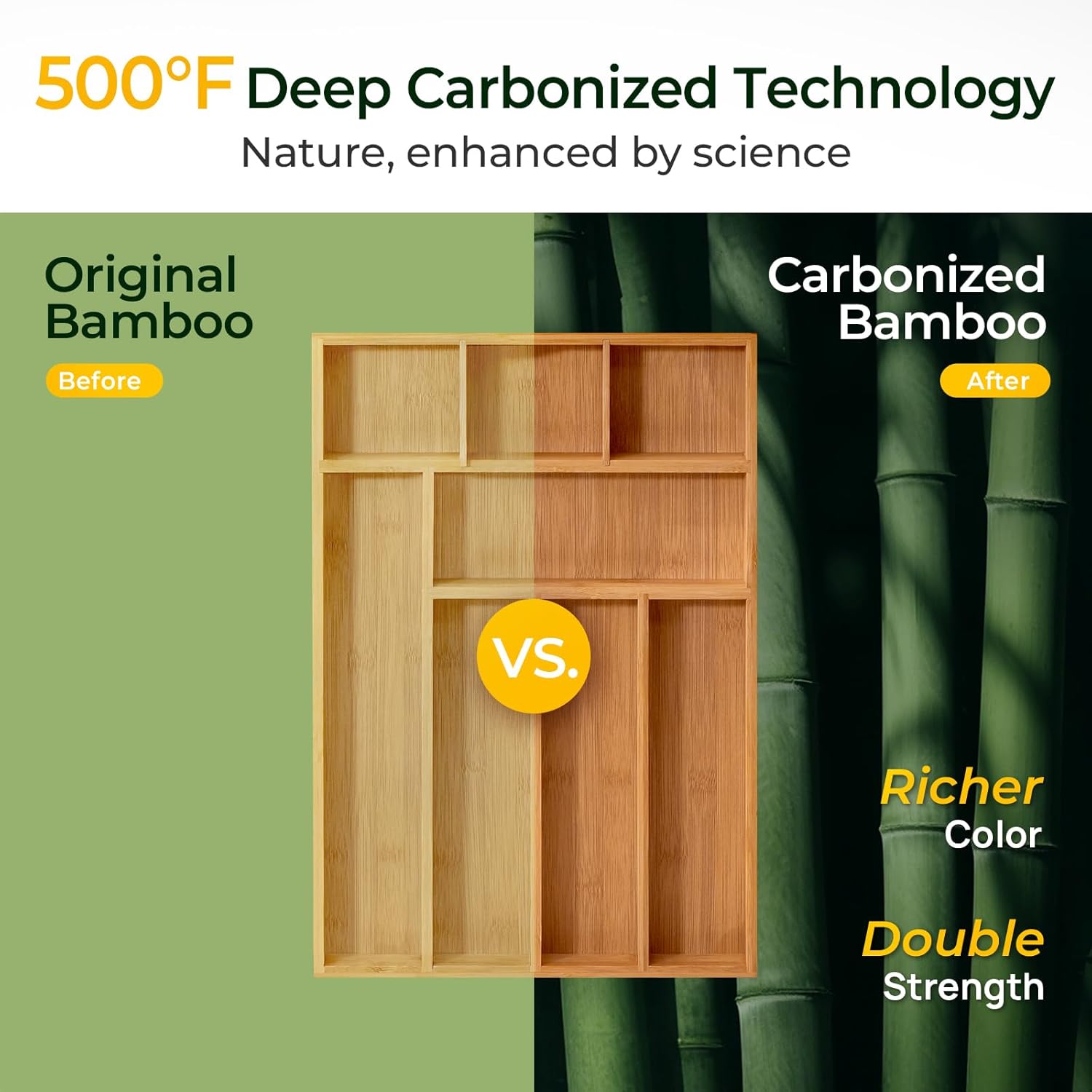 - HEAT-TREATED BAMBOO STRENGTH: Our premium bamboo undergoes a unique 500°F carbonization process, making it exceptionally resistant to cracking, warping, and moisture for unparalleled, long-term durability.