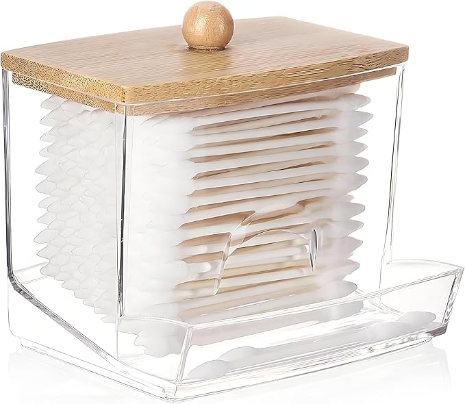 AXX Qtip Dispenser Apothecary Jars Bathroom - Qtip Holder Storage Canister Clear Plastic Jar for Cotton Swab,Q-Tips,Cotton Rounds (B#Bamboo 1Pcs)