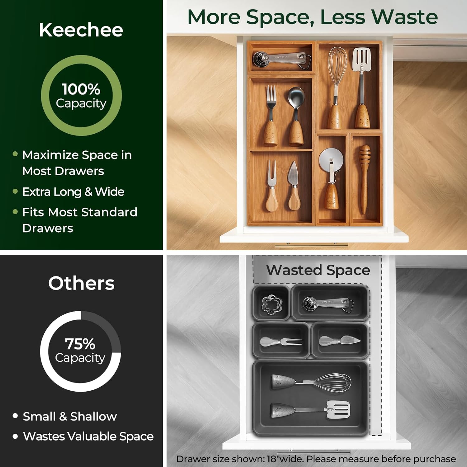 - EXTRA DEEP STORAGE: At 2.2” DEEP—significantly taller than standard trays—our organizer holds bulky gadgets and more stacked silverware without ever jamming the drawer.