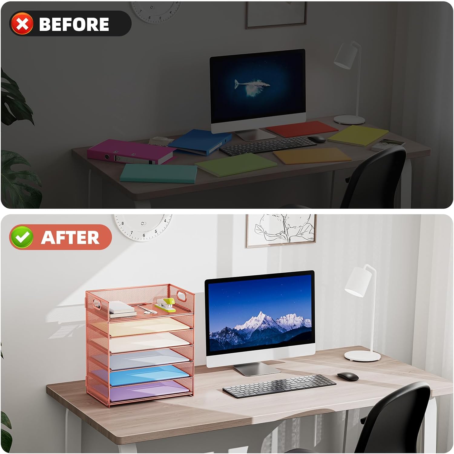 Marbrasse 2 Pack Desk Organizer with Handle, 6 Tier Paper Letter Tray, Mesh Desk File Organizer for Office, School and Home - Rose Gold