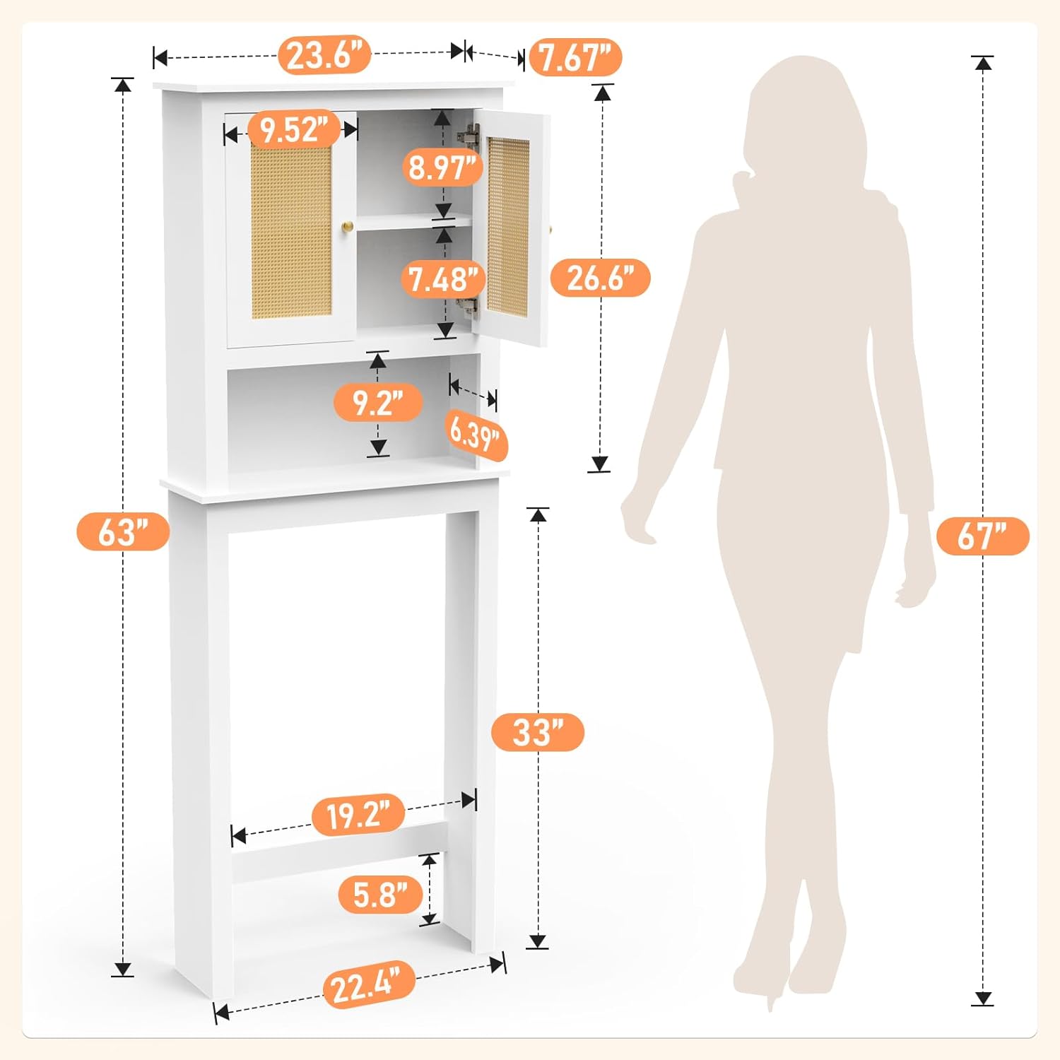 - 【FITS MOST TOILETS】: The overall size of this above toilet organizers are 24 inches (width) × 8 inches (depth) × 63 inches (height), with a distance of 33 inches from the bottom shelf to the floor. The toilet cabinet features a sturdy wooden structure with a load capacity of up to 220 pounds, ensuring stability during daily use.