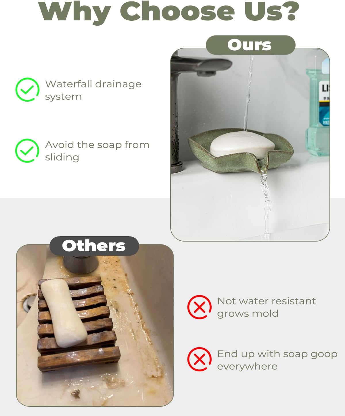 Self Draining Soap Dish, Ceramic Drain Soap Holder Waterfall Design Soap Saver for Shower, Bathroom, Sink, Kitchen and Countertop, Keeps Dry, Green