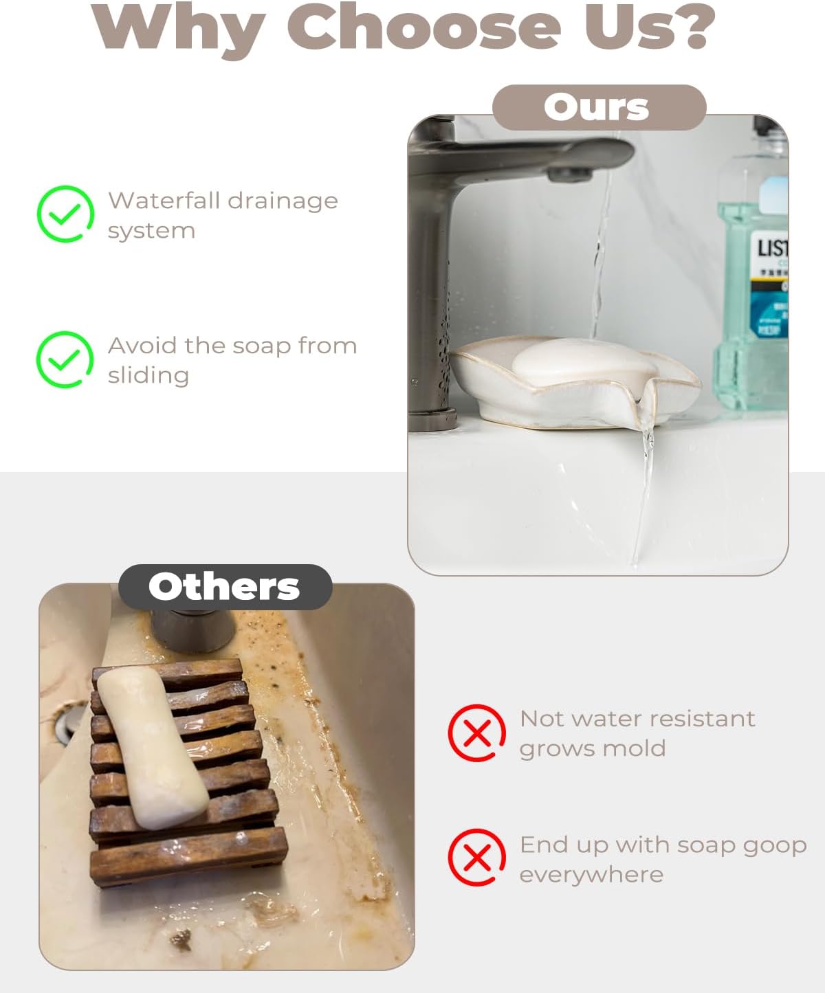 Soap Dishes, Ceramic Shower Soap Dish with Waterfall Design Bar Soap Holder Self Draining Soap Saver for Shower, Bathroom, Sink, Kitchen and Countertop, Beige White