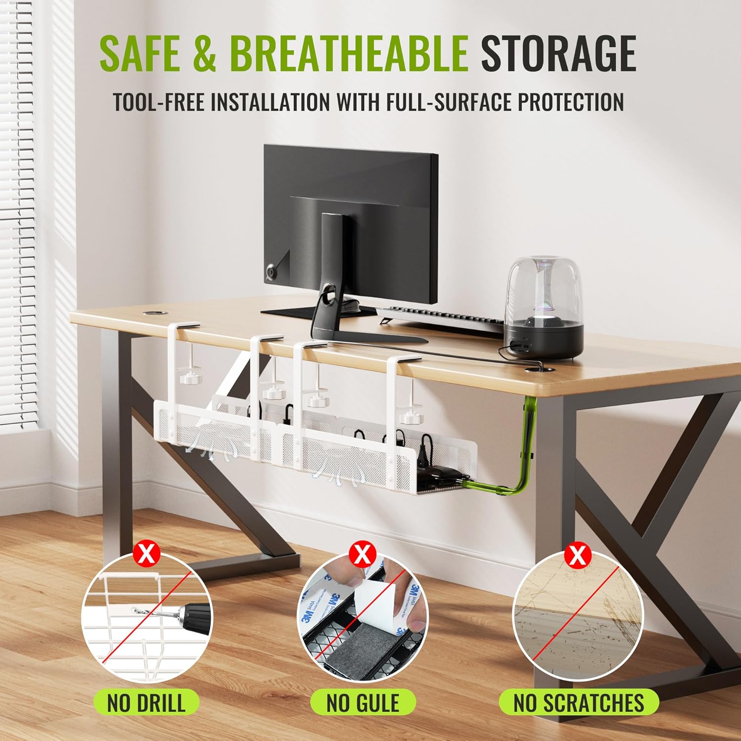 - Save Storage Space - Our wire management under desk features an innovative hollow design that efficiently organizes power strips, adapters and all cables - completely eliminating floor clutter. The under desk cable management tray solves tangled cord problems while creating extra storage for office supplies, keeping both your desk and floor perfectly tidy.