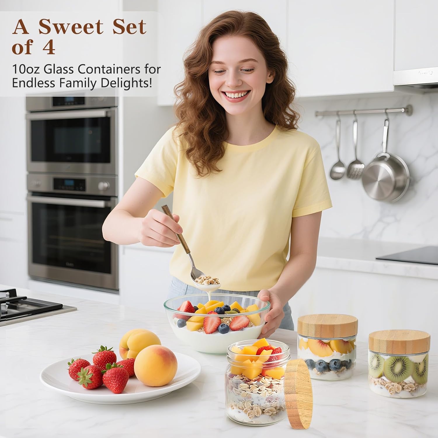 10oz Overnight Oats Containers with Bamboo Lids, Glass Jars with Airtight Lids, Wide Mouth Mason Meal Prep Jars, Food Storage Container for Yogurt Salad Chia Pudding Snacks Spice Sugar,4 Pack