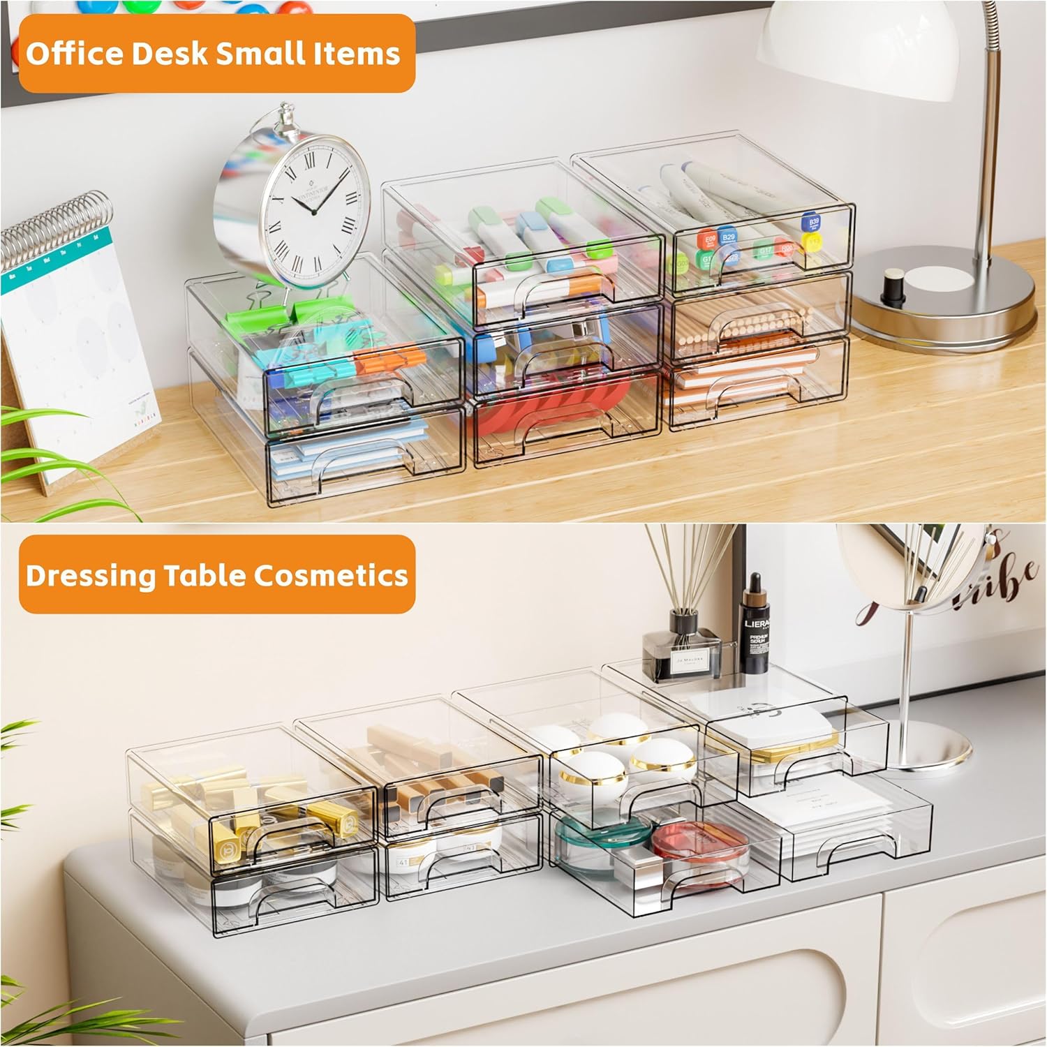 - 【Stackable Clear Organizers Drawers】this acrylic office organizer each one can be used independently,Different quantities of sets are also enough for you to place in multiple places, very good value.You can also use them side by side or use it alone,and comes with anti slip silicone foot pads to prevent movement during use