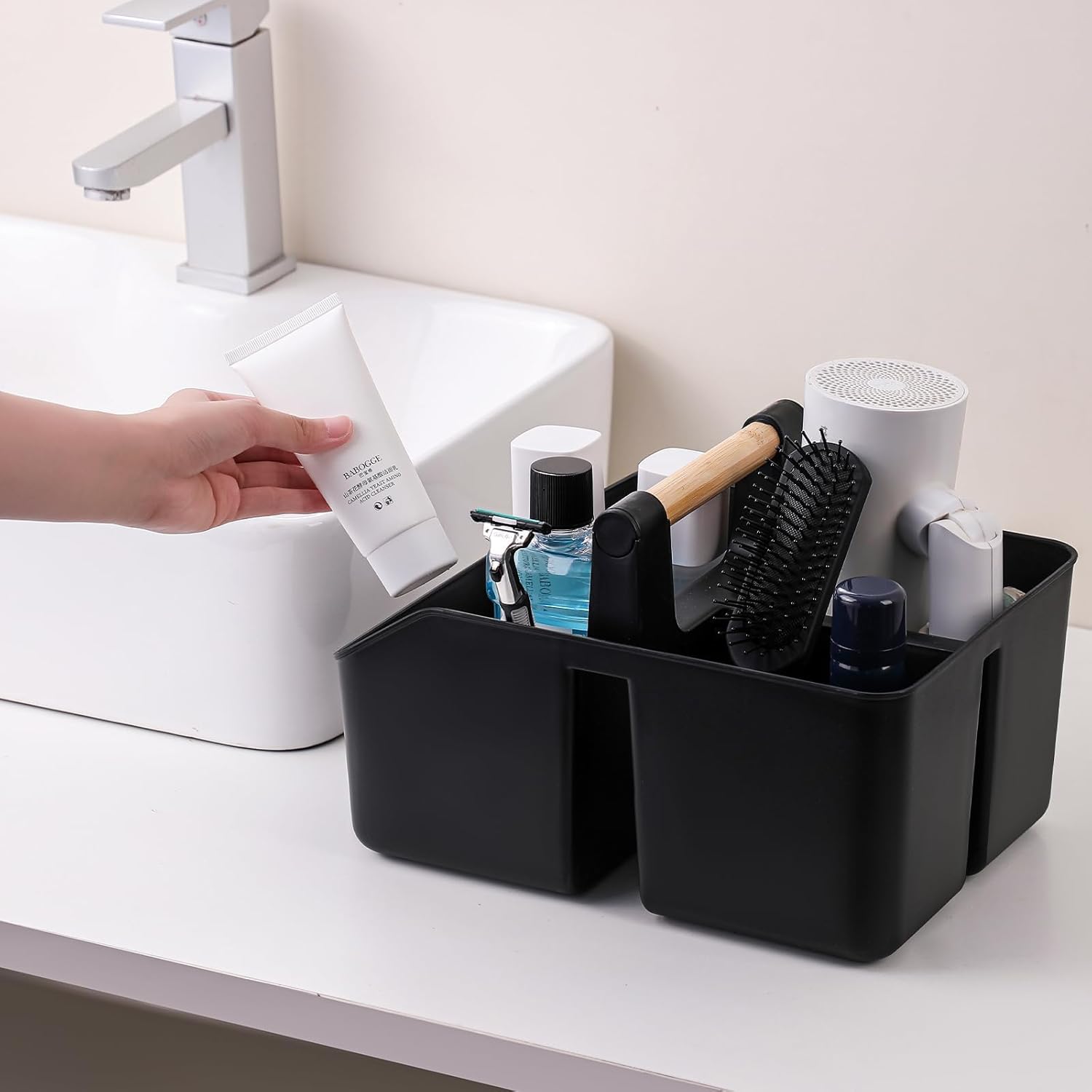 - Storage Capacity: Wider compartments easily fit large bottles—including 1L shampoo, conditioner, and big body wash—that don’t fit in standard hanging wire caddies or most regular plastic shower baskets. The spacious design makes it easy to move everything at once. Ideal for use as a bathroom organizer, vanity storage, or cleaning caddy