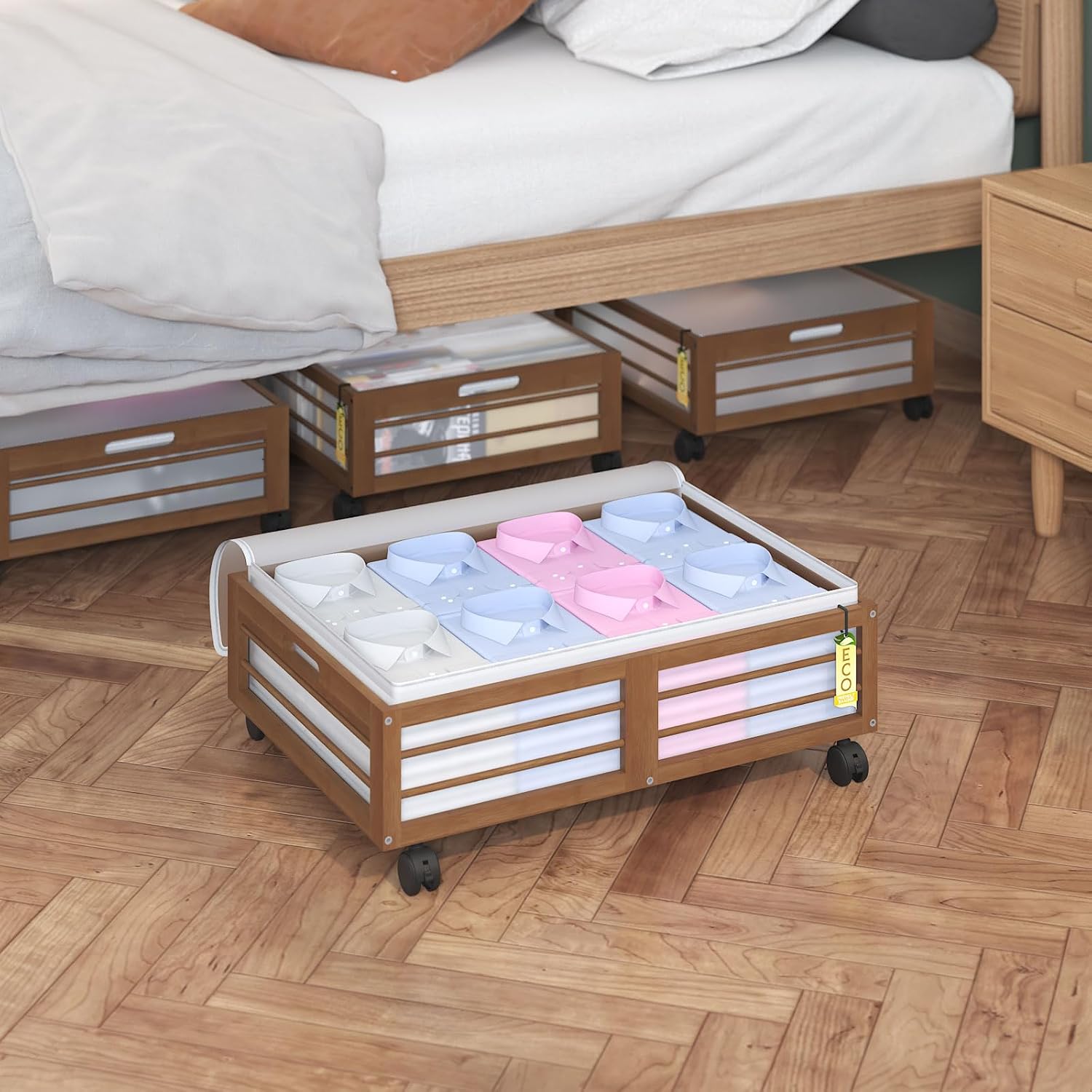 Under Bed Storage Containers with Wheels, Larger Bamboo Wood Under Furniture Storage Containers with Dust Bags๏ผRolling for Shoes Clothes