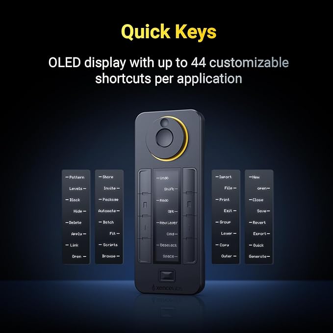 - Quick Keys Included: Quick Keys' OLED display shows 8 shortcut keys across 5 different sets with 4 additional customizable dial actions. Quick Keys offers users enhanced productivity with up to 44 total customizable shortcuts per application. The shortcut keys automatically switch to the application being used, keeping you focused on creating and not your tools.
