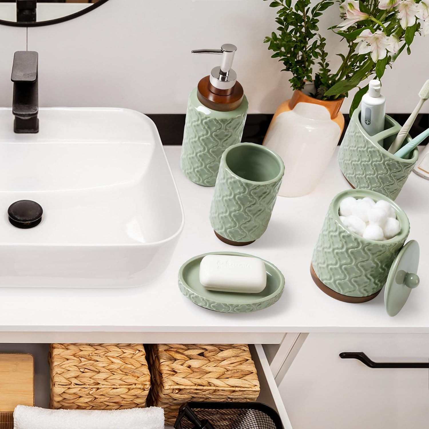 Bathroom Accessories Set 5 Pieces Toothbrush Holder Soap Dispenser Ceramic Bathroom Accessory Set Contain Cotton Swab Jar Toothbrush Cup Soap Dish Tumbler Green