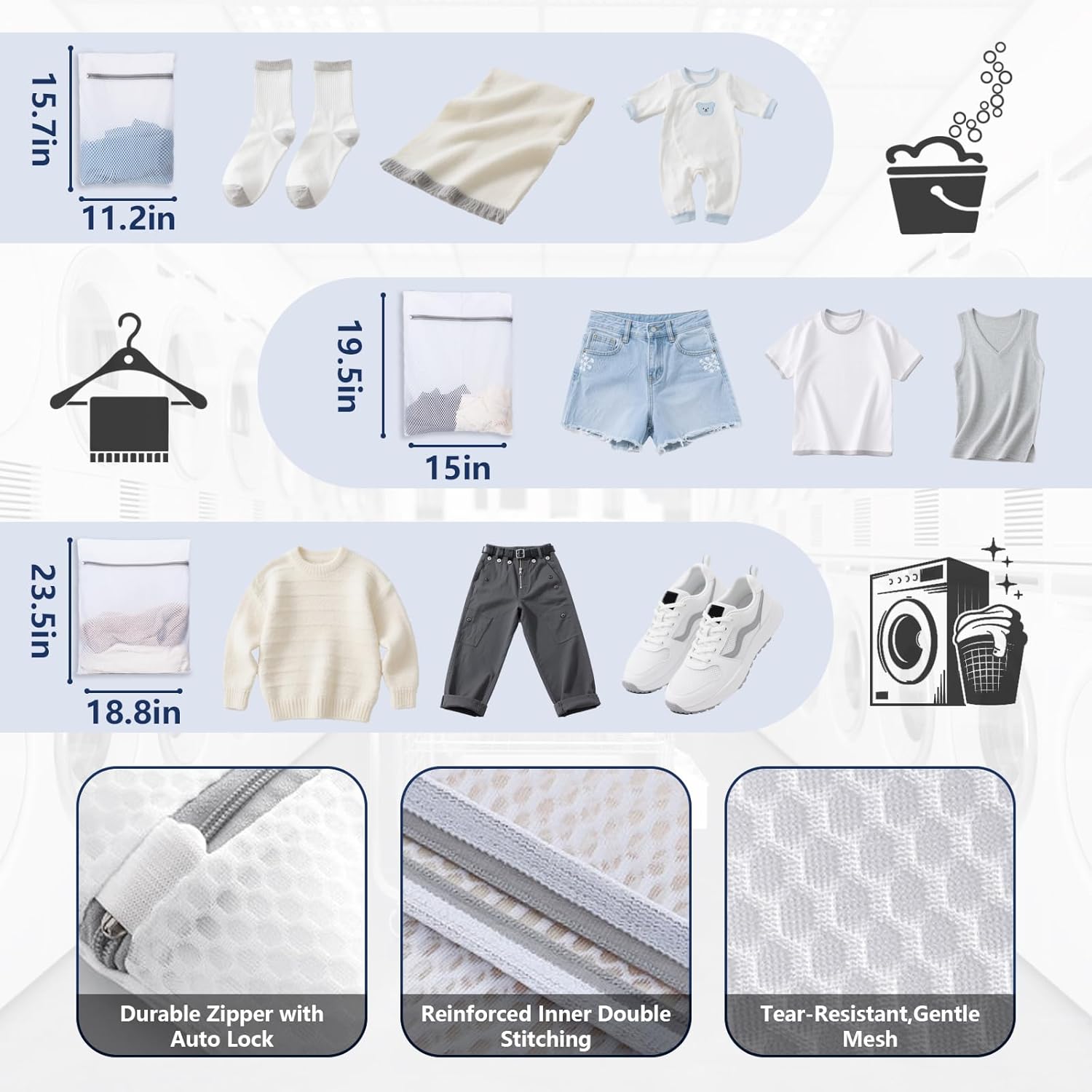 Laundry Bag Backpack with 3 Sizes Mesh Wash Bags and Shoulder Straps Foldable Clothes Hamper Bag with Drawstring Closure for College, Apartment, Laundromat (Black)