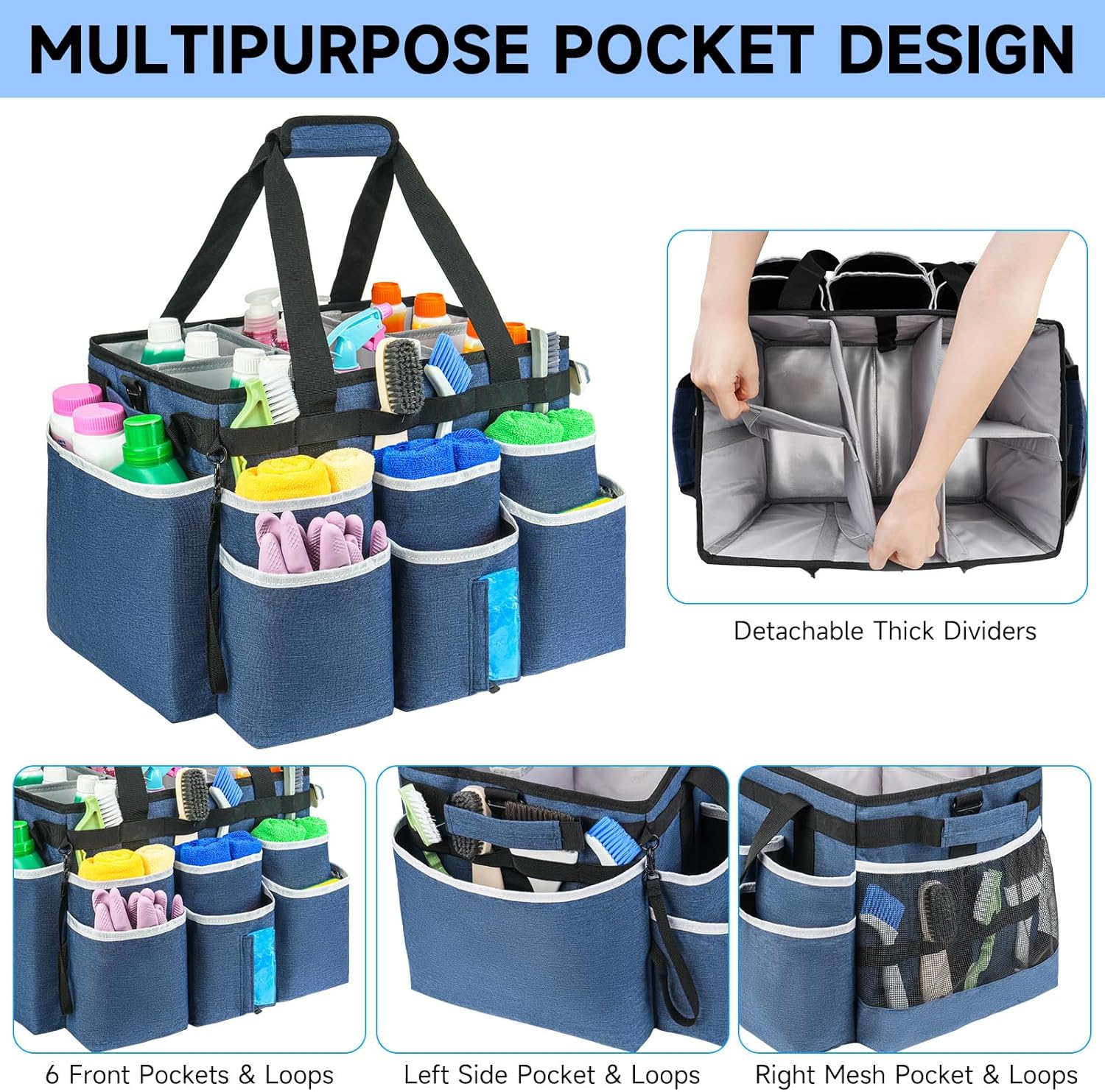 - Large Capacity: This cleaning caddy bag comes with removable dividers that can be freely adjusted. Meanwhile the outside has 6 front side pockets with fixed elastic loops, two side pockets with loops, and a hanging strap, which can be used to organize trash bags, towels, brushes, sponges, trash bags, gloves and other cleaning supplies