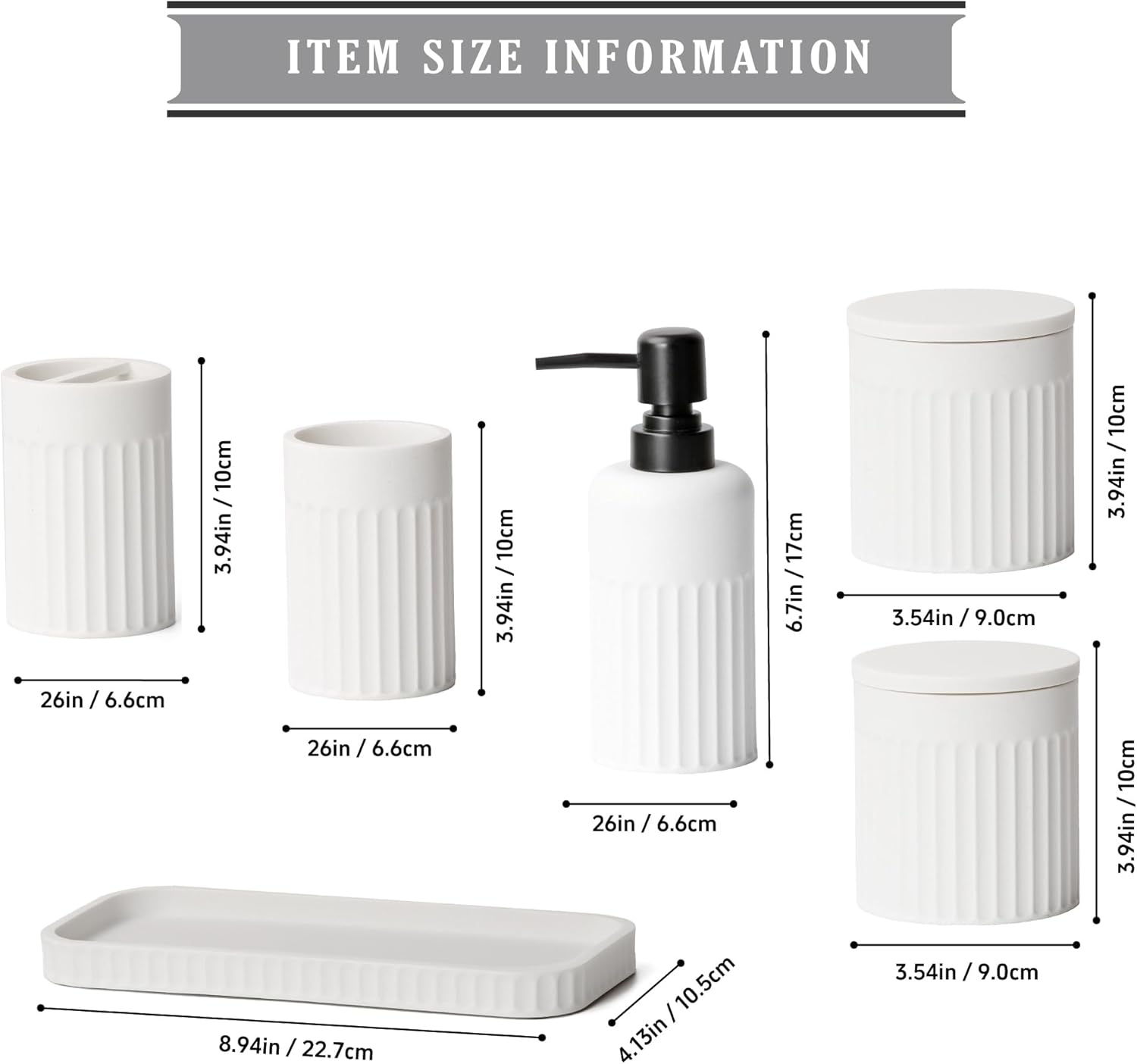 Bathroom Accessory Set - 6 Pieces Bathroom Accessories Set Complete with Soap Dispenser, Toothbrush Holders, Tumbler, Vanity Tray and 2 Qtip Holder for Home Organizer and Decor, White