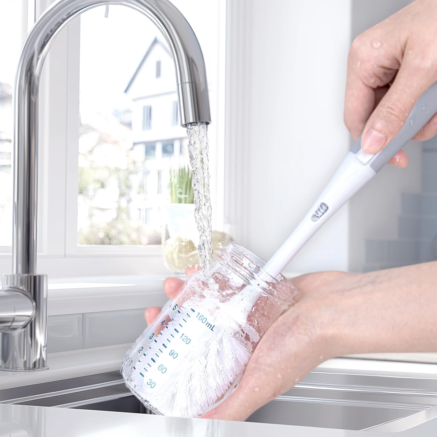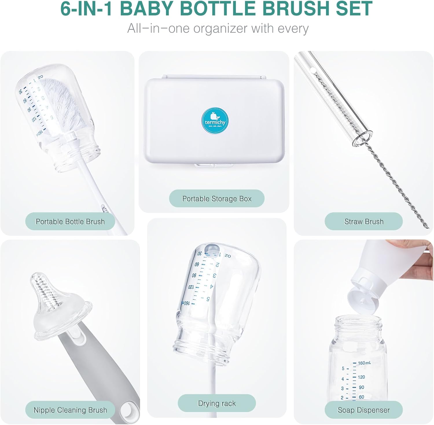 - 6-in-1 Travel Bottle Cleaning Kit: Cleaning kit includes a 360° rotating brush (removes stubborn formula residue), precision nipple cleaner, foldable drying rack, leak-proof soap dispenser, and compact storage case.Perfect for hotel sinks, airport bathrooms, or roadside stops—no more hunting for scattered cleaning supplies.