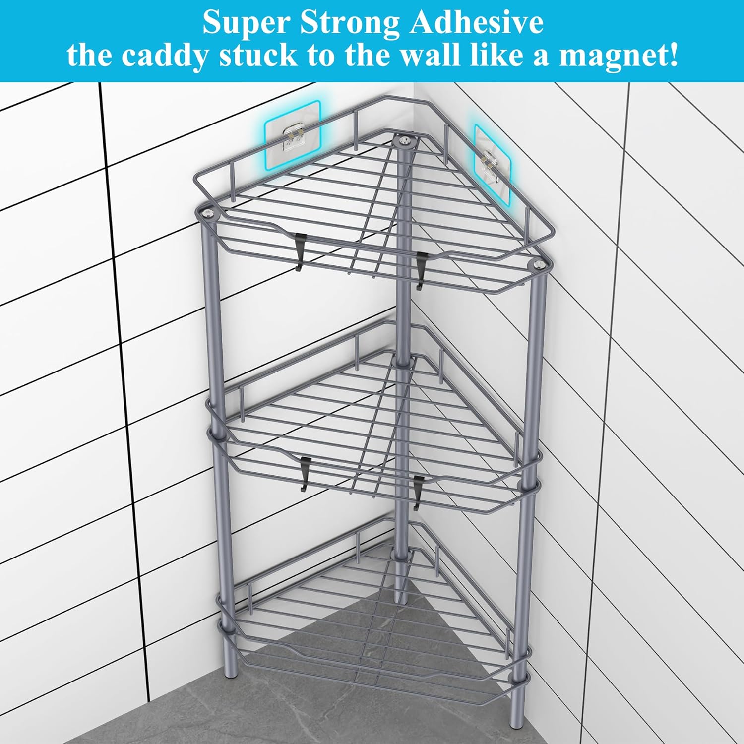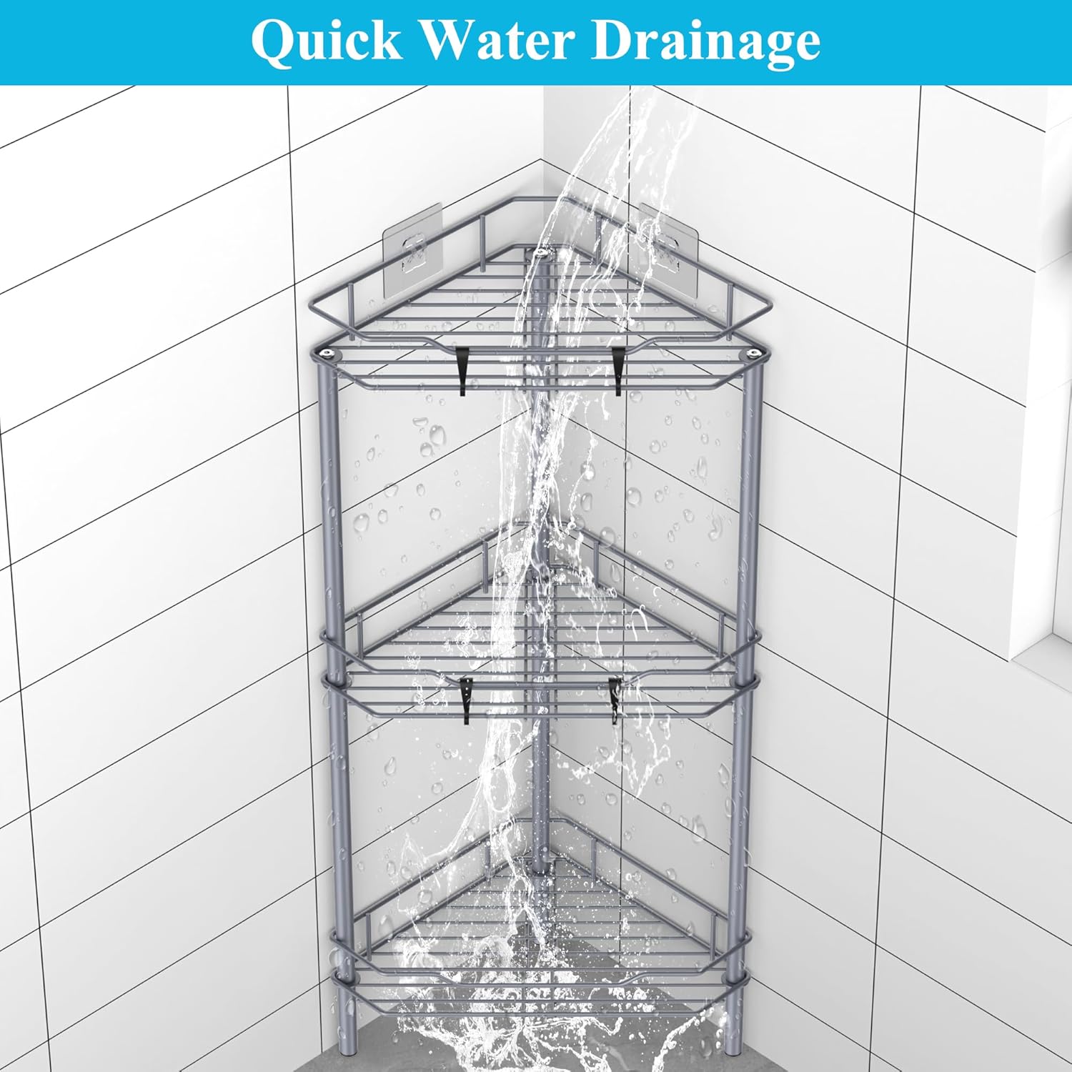 3 Tier Floor Standing Corner Shower Caddy Organizer Shelf with Hooks, Bathroom Shelves Stand Rack, Dark Gray