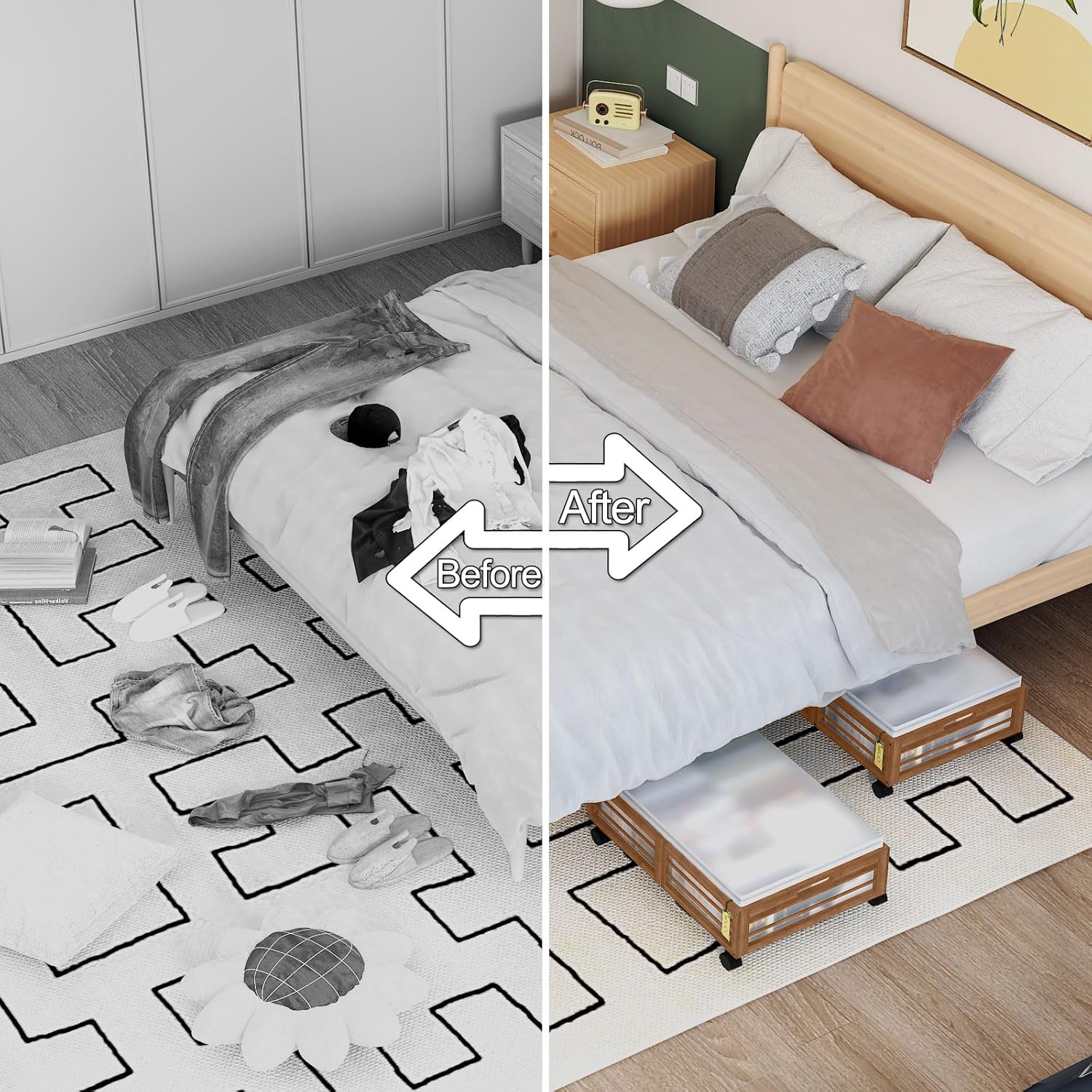 - DURABLE AND LIGHTWEIGHT: This rolling under bed storage, crafted from bamboo, is sturdy, long-lasting, and lightweight—yet it boasts a stable load capacity, holding up to 120 pounds without warping.
