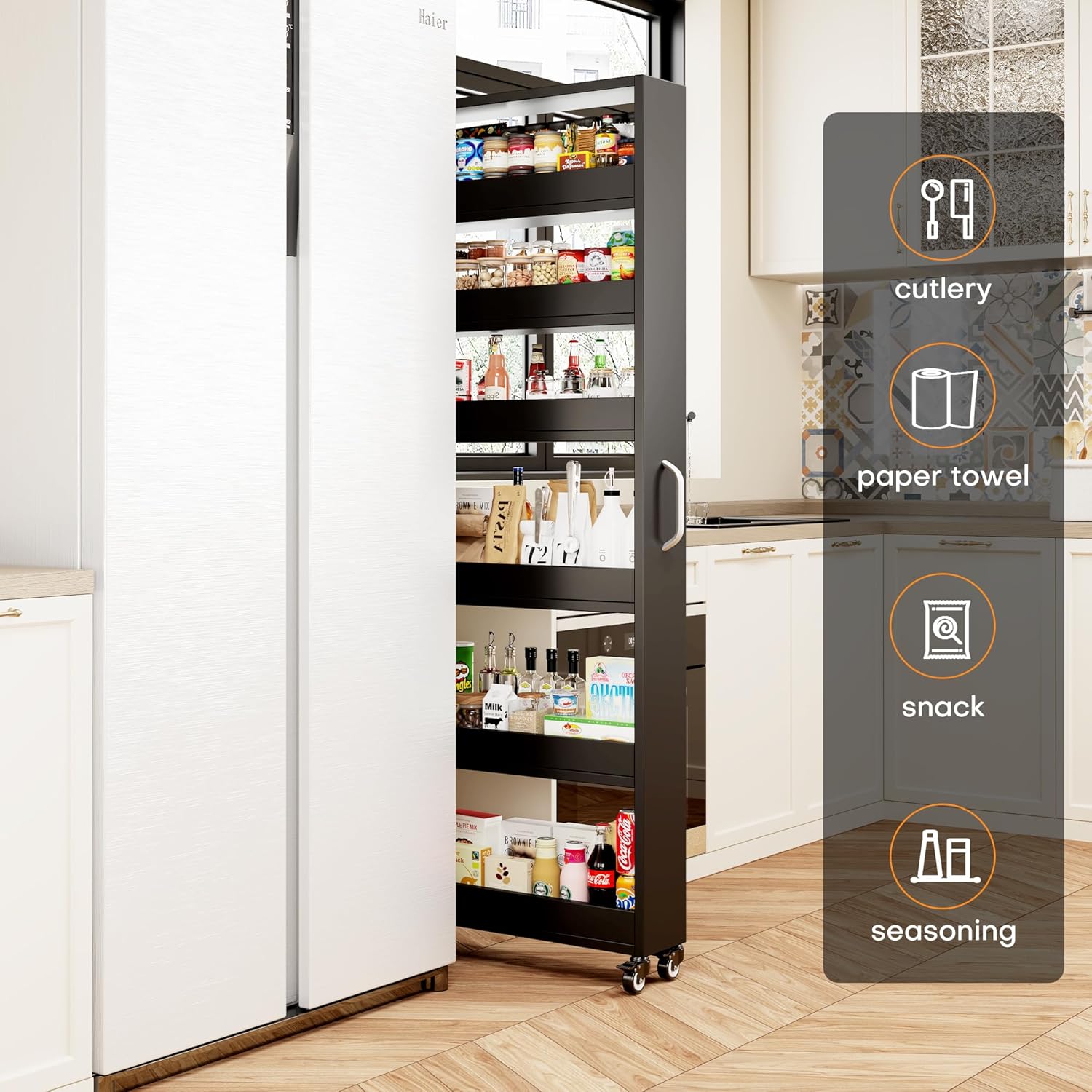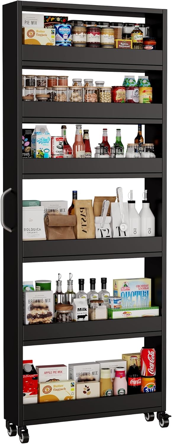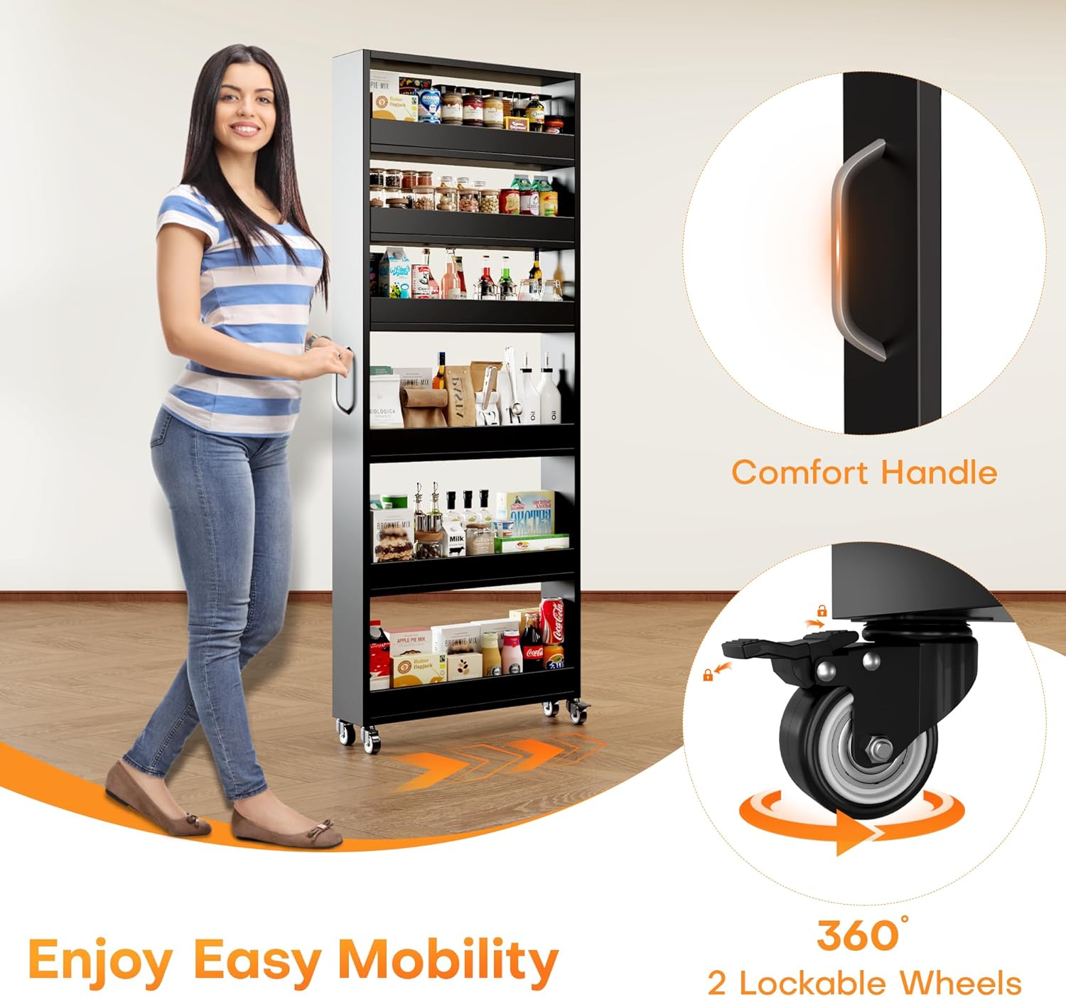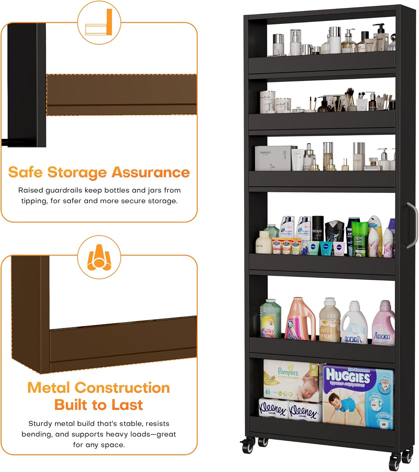 - Sturdy and Durable: This 6 tier slim rolling cart is made from strong steel, featuring a robust frame and a smooth powder-coated surface with excellent rust resistance. Whether placed in dry or humid environments, it ensures long-lasting durability, making it perfect for extended use.