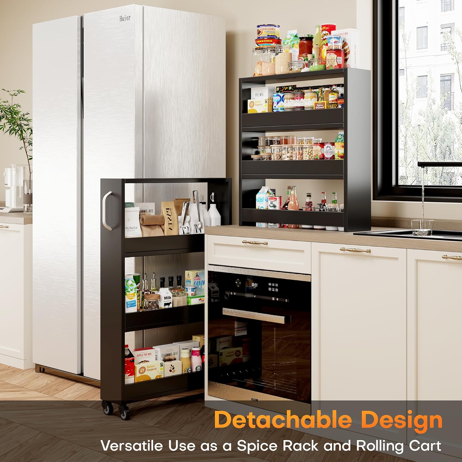 - Multifunctional Storage Cart: This multifunctional rolling utility cart can be split into two parts, serving as a countertop shelf and a rolling storage cart. It can serve as a kitchen cart, bathroom storage cart, bedside cart, snack cart, spice rack next to the fridge, or office shelf, making it ideal for storing spices, toiletries, tools, books, and more.