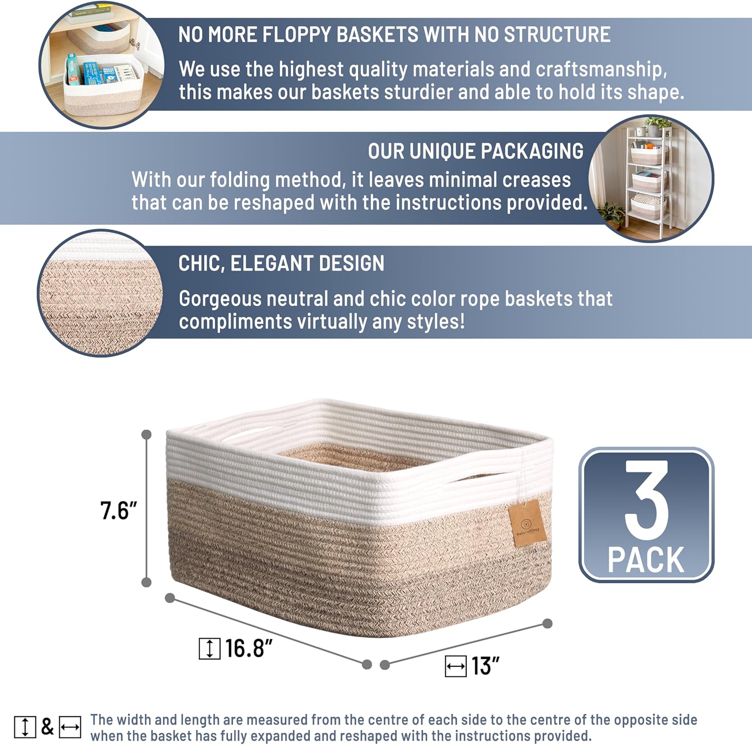 NaturalCozy Storage Baskets 16.8”x13”x7.6” Cotton Rope Woven Baskets for Organizing 3-Pack | Toy Storage Bins | Basket for Shelves, Laundry, Blanket, Clothes, Closet, Kitchen, Bathroom, Gifts