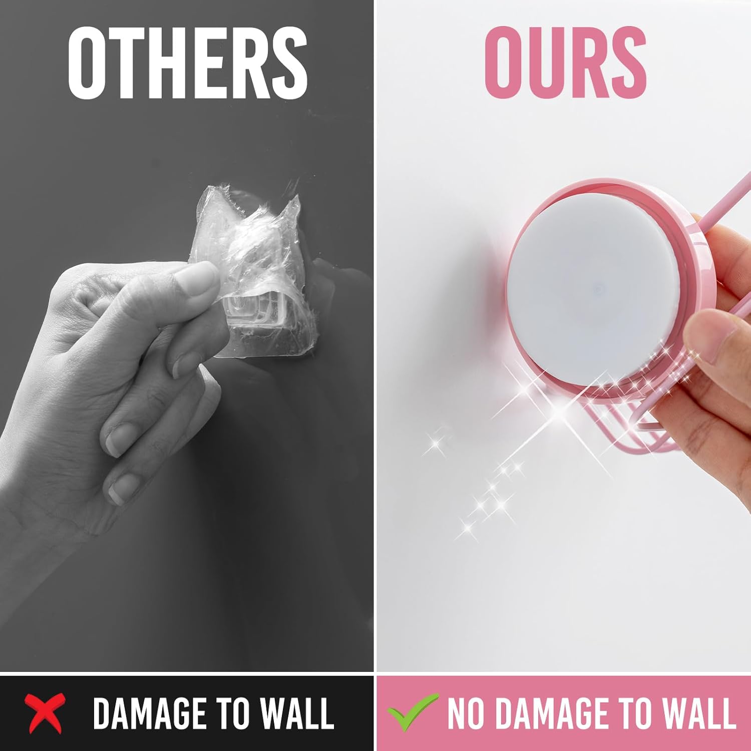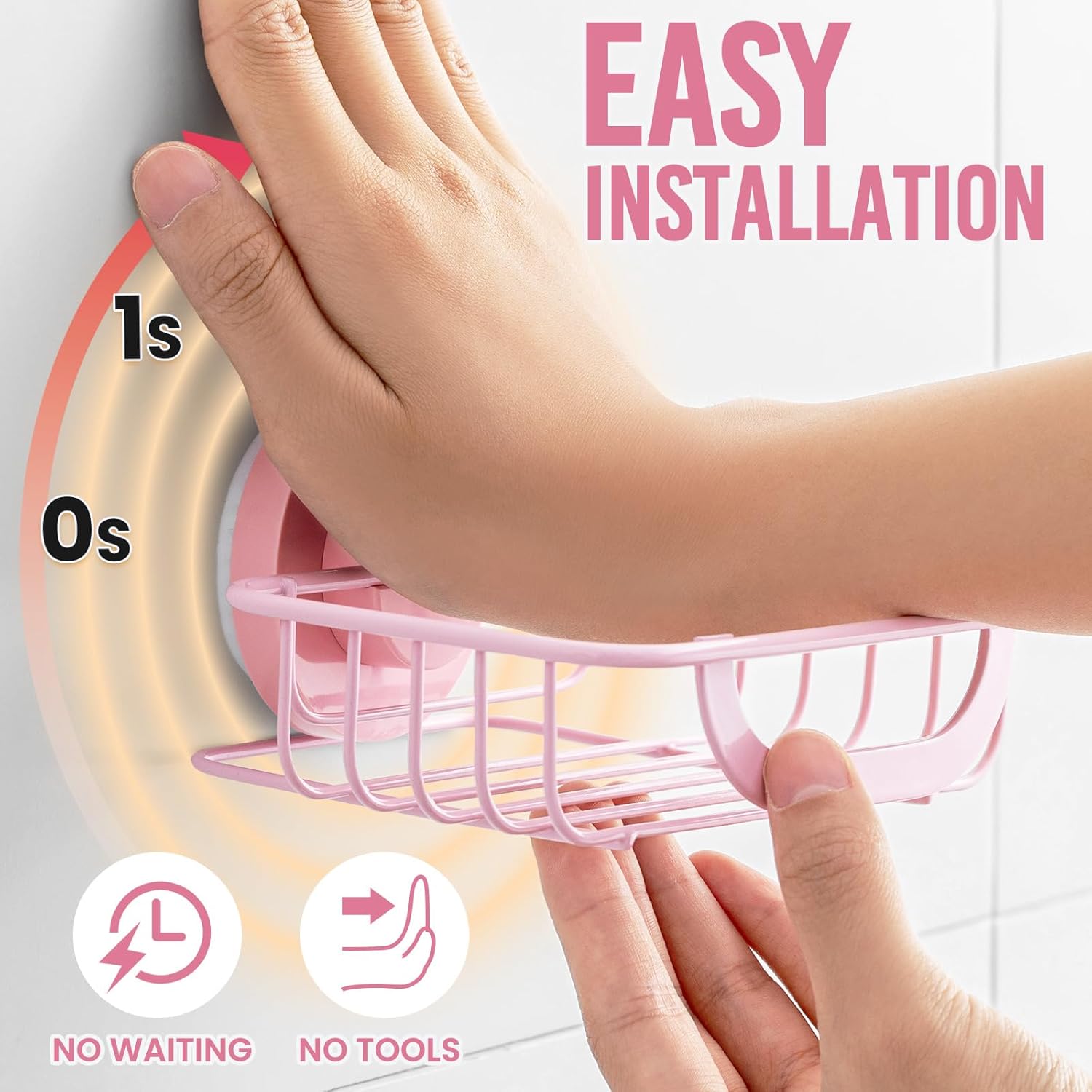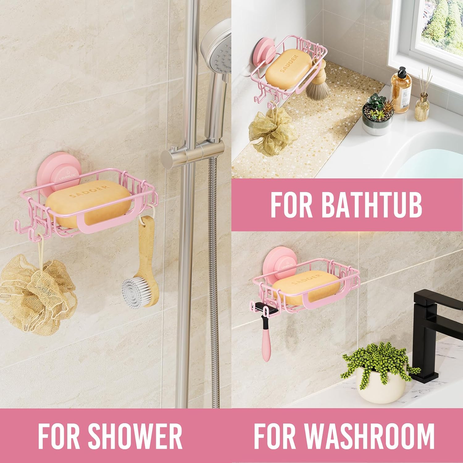 LEVERLOC Soap Holder Dish with Hooks for Shower, Bar Suction Cup Soap Tray Wall Mounted, Rustproof Stainless Steel Sponge Holder Caddy for Bathroom Bathtub Kitchen Sink, Pink