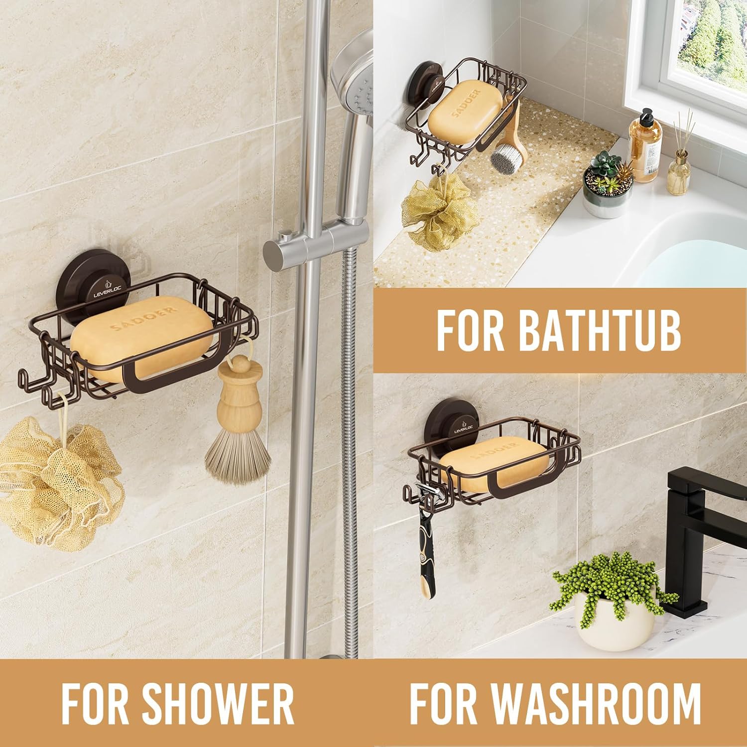 LEVERLOC Soap Holder Dish with Hooks for Shower, Bar Suction Cup Soap Tray Wall Mounted, Rustproof Stainless Steel Sponge Holder Caddy for Bathroom Bathtub Kitchen Sink, Brown