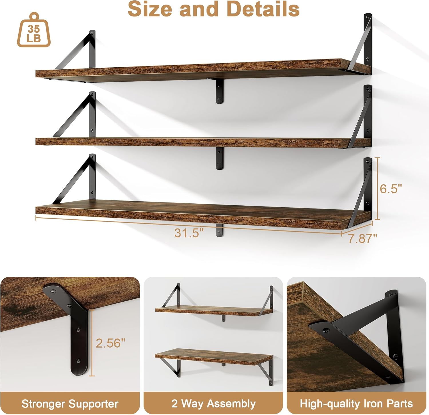 - 【High Stability & Easy Installation】The wall-mounted shelves feature classic triangular brackets and reinforced central metal frames; each shelf supports up to 35 lbs with exceptional stability. All hardware is included, along with detailed step-by-step instructions for a smooth and quick DIY assembly—ideal for living rooms, home offices, or classroom displays.