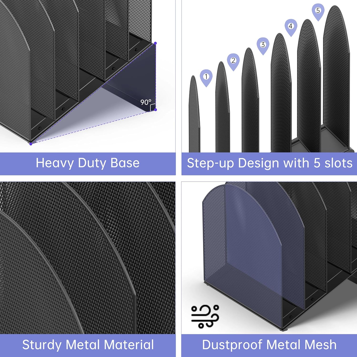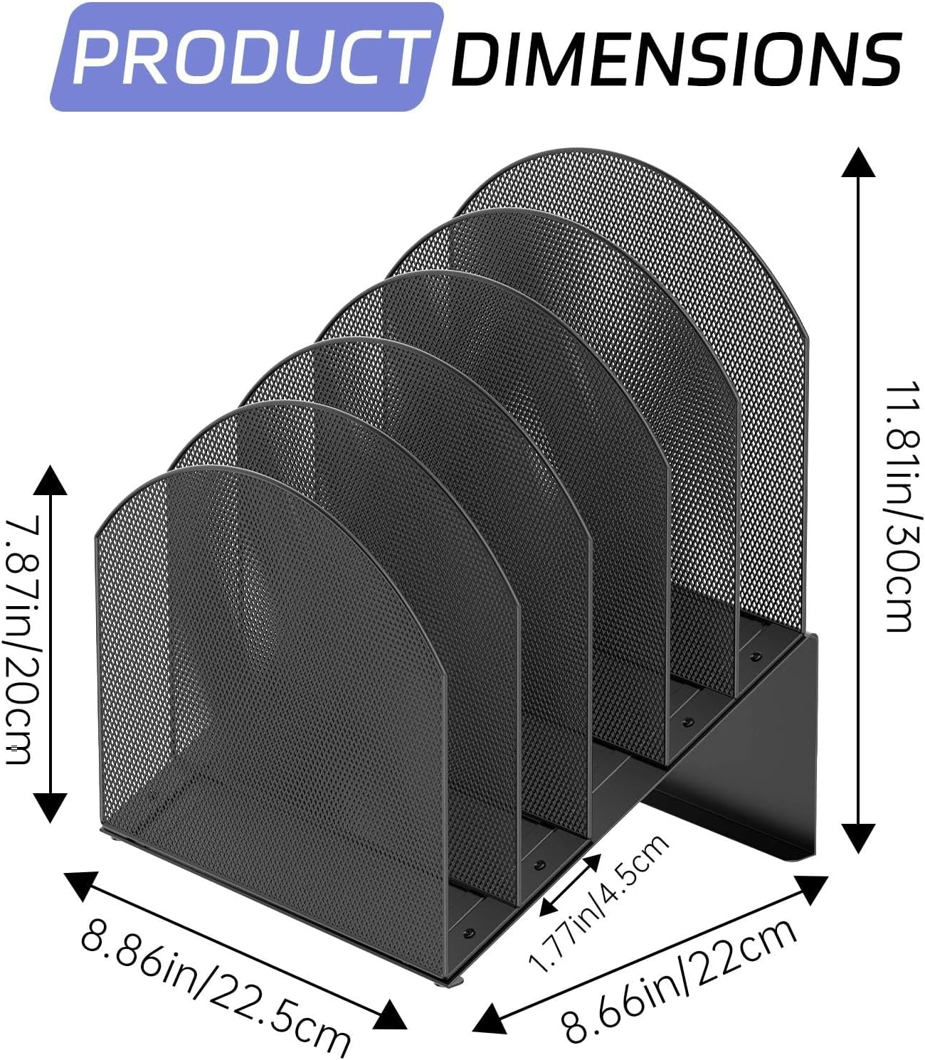 5-Tier Desk File Organizer, Vertical File Folder Organizer. Metal Mesh Mail Rack, Document & Record Holder and Storage for Home Office School, Black
