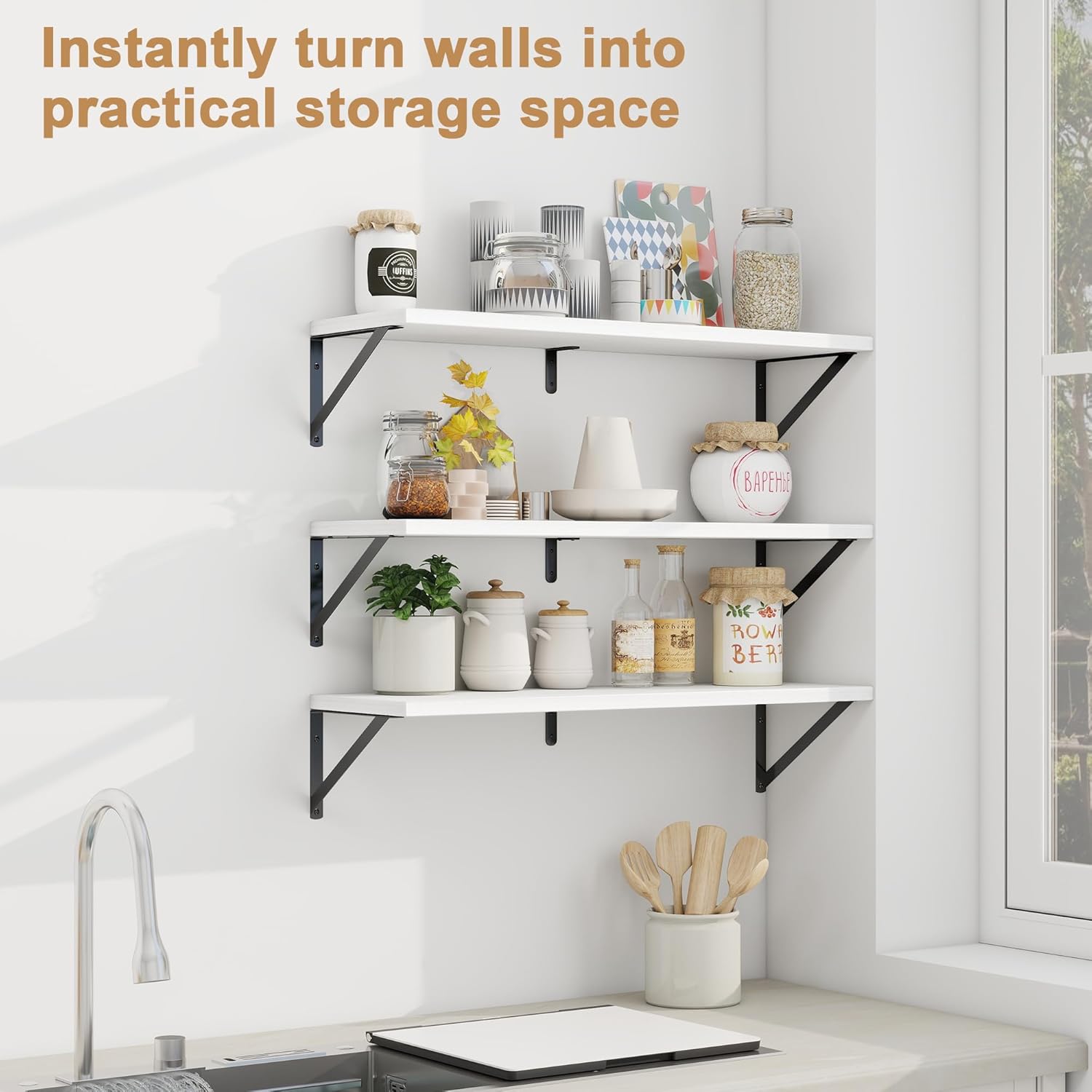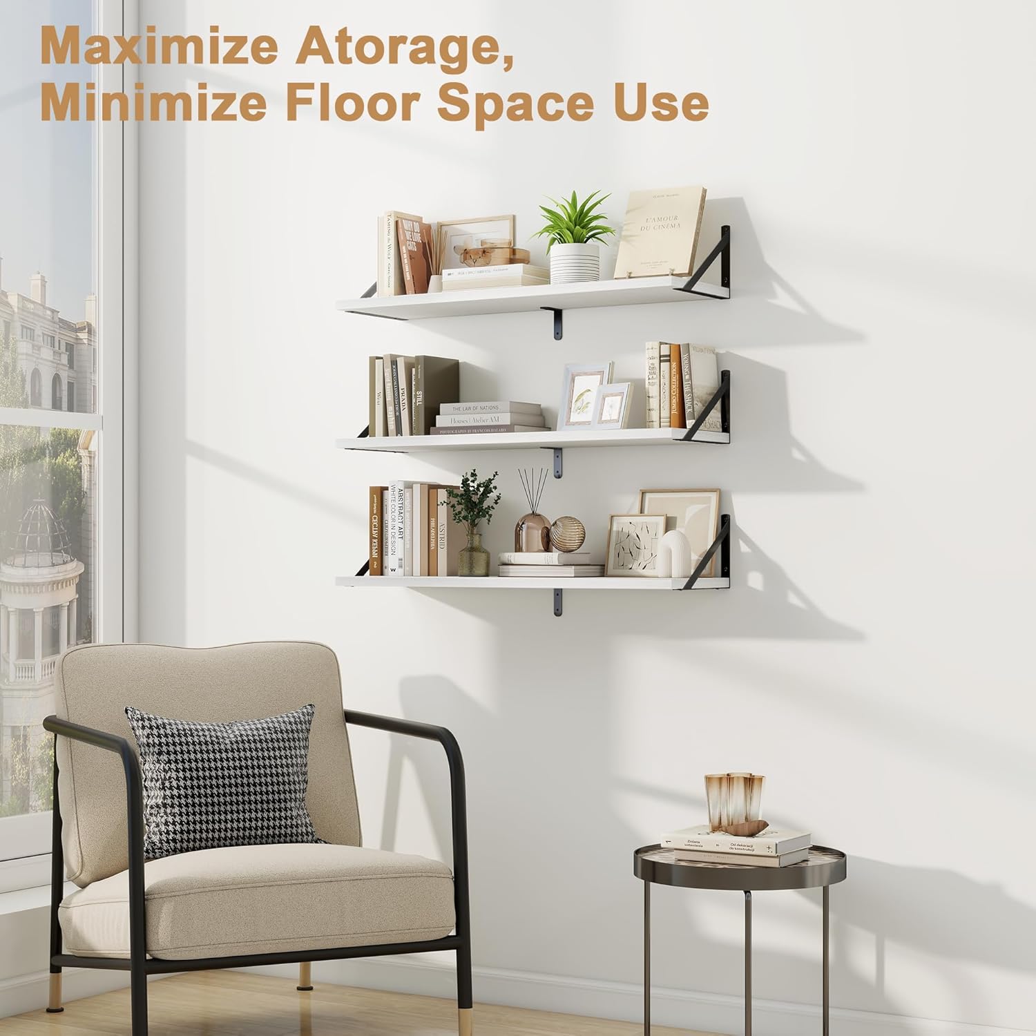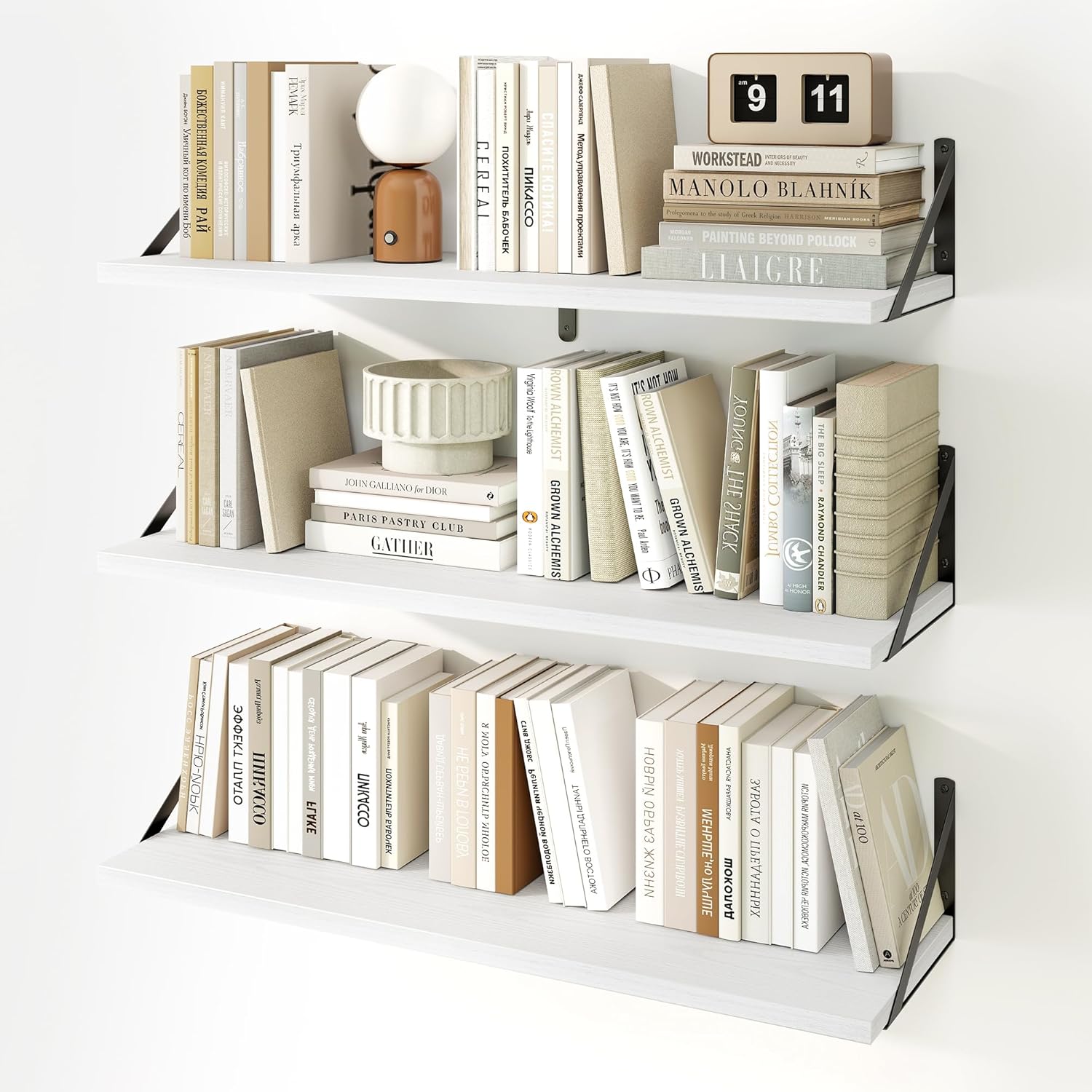 Fun Memories Floating Shelves, 32 x 8 Inches, Set of 3 Wall-Mounted Bookshelves with Metal Brackets, Decorative Storage for Home and Office (White)
